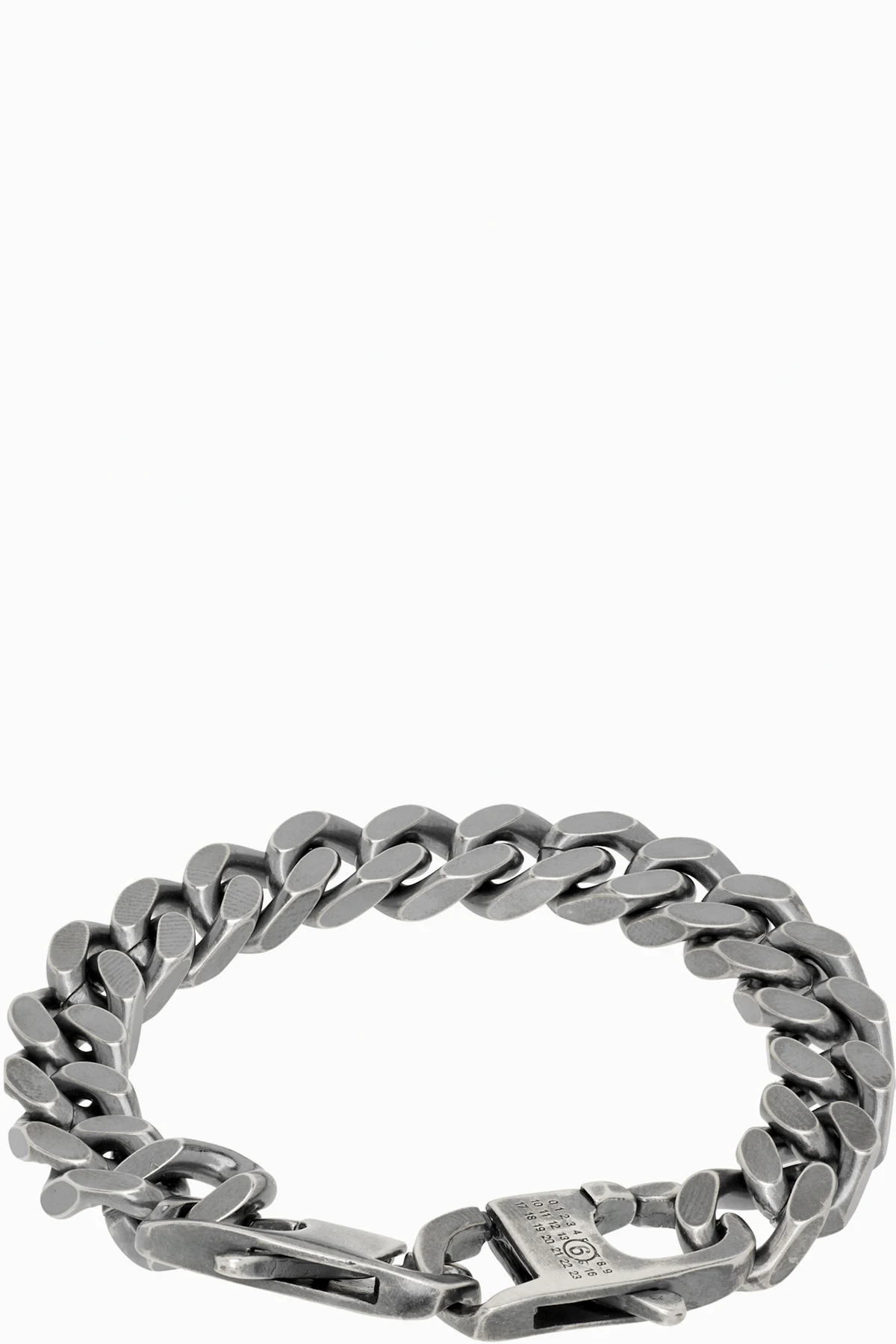 Curb-chain bracelet in antiqued silver-tone brass. Engraved logo and hallmarking at adjustable two-way lobster clasp.