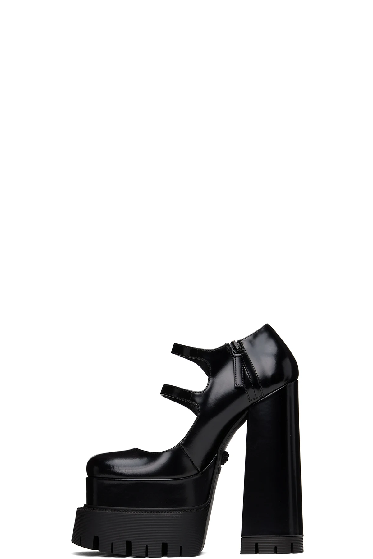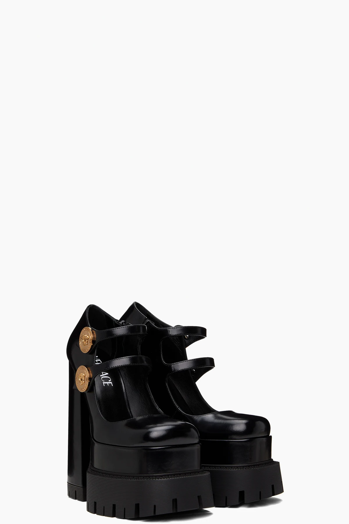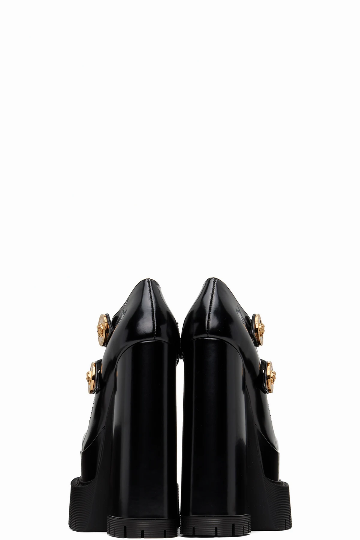· Rubberized Medusa hardware at polished calfskin outsole