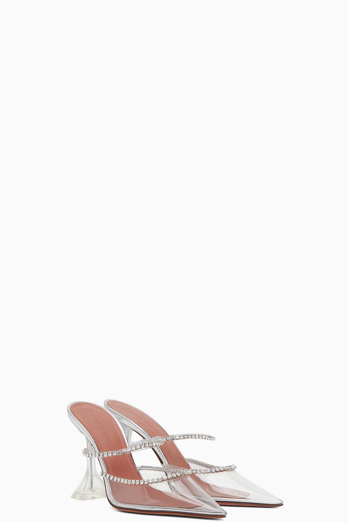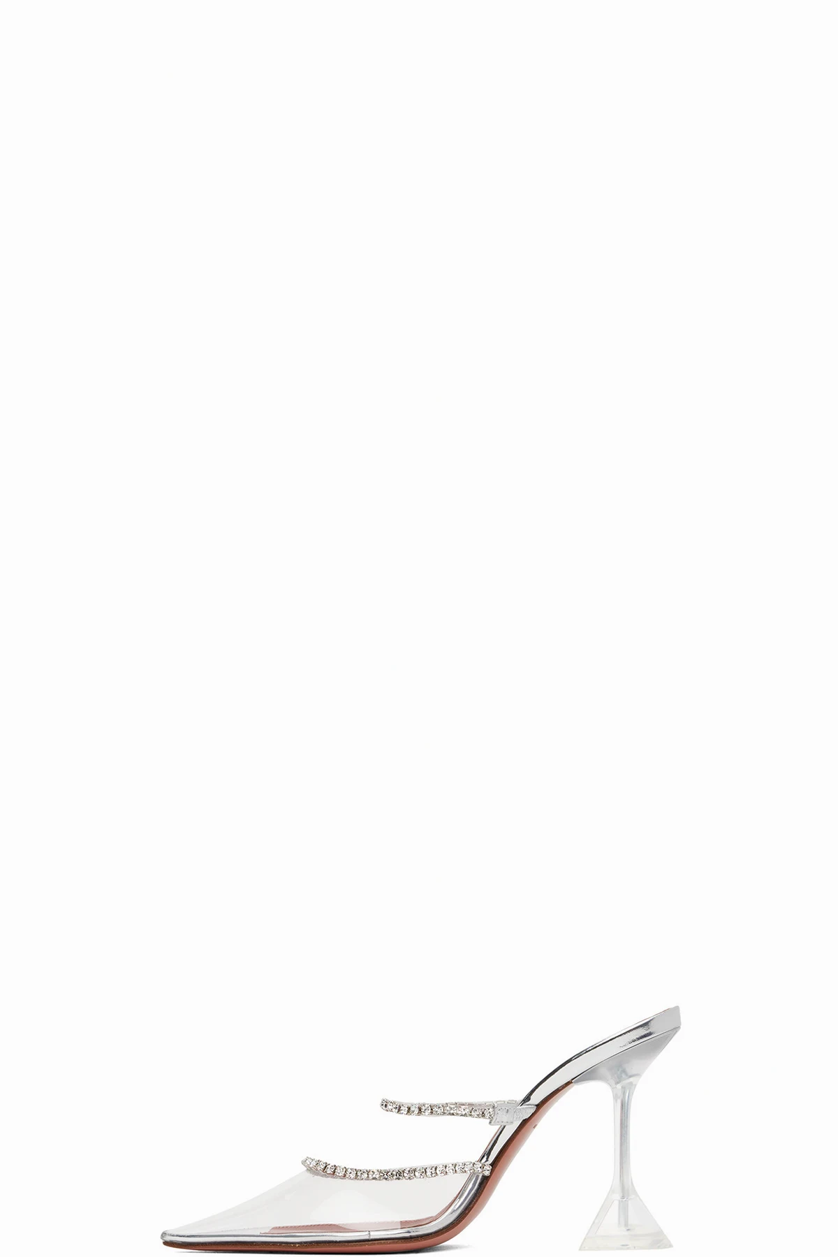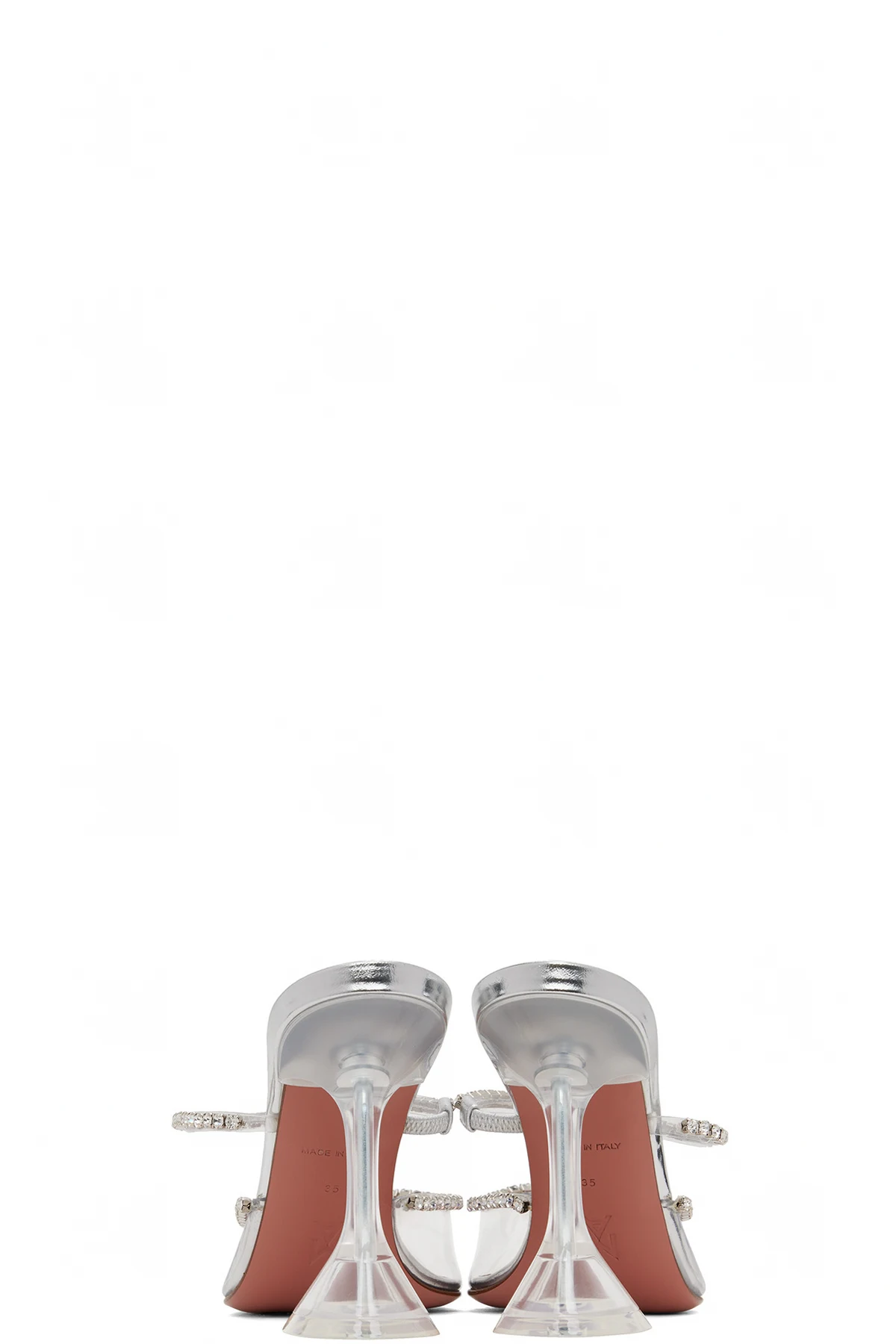 PVC heels in metallic silver-tone. Crystal-cut detailing throughout.