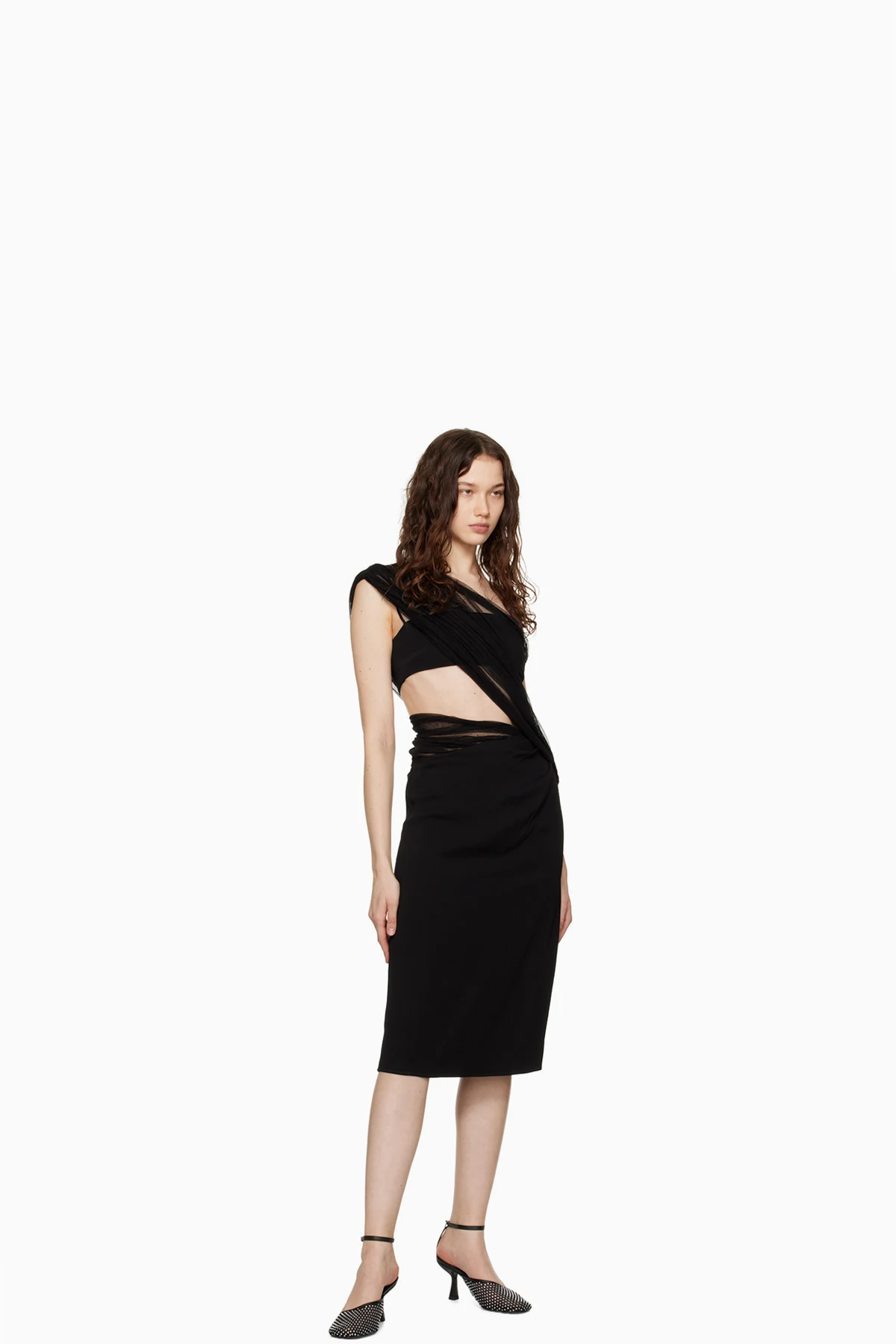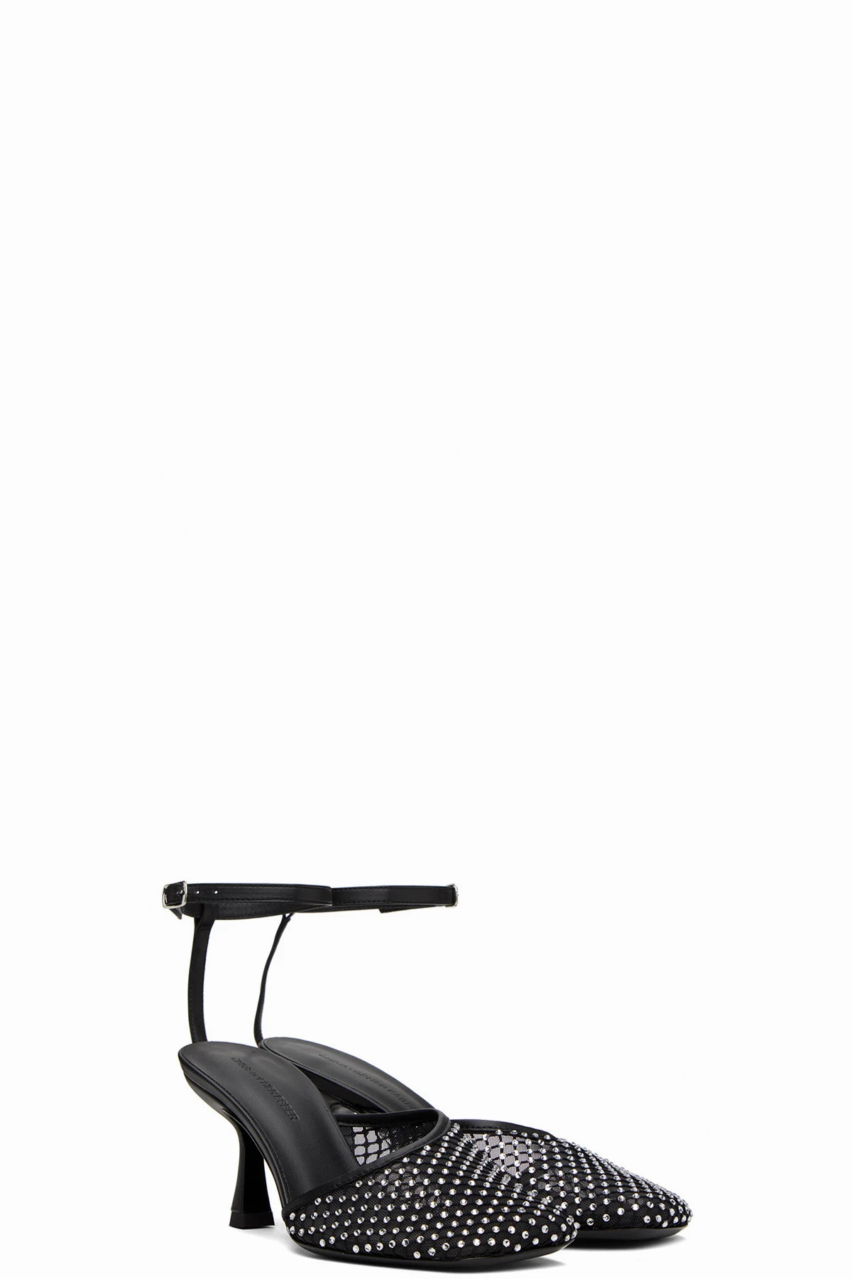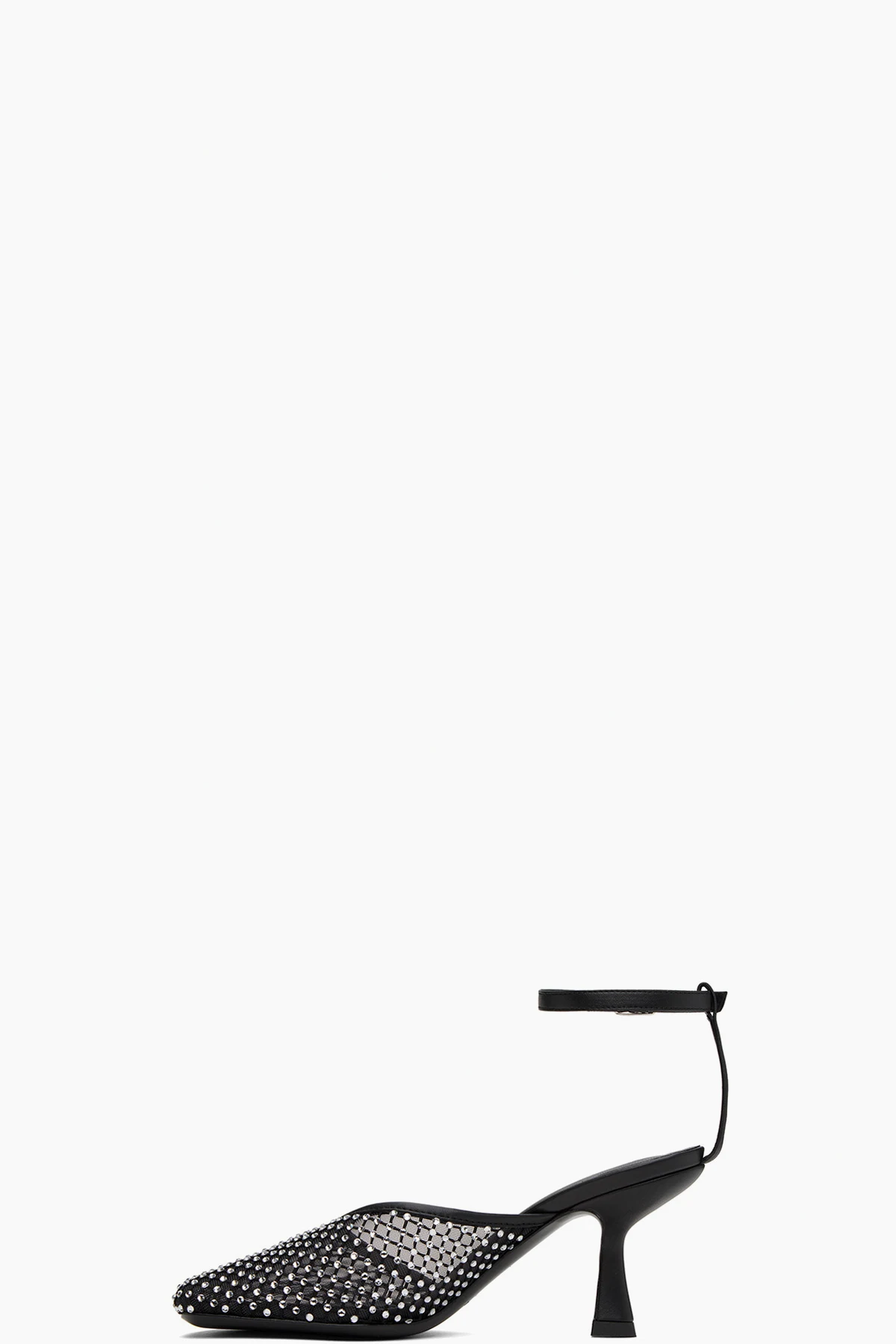 Semi-sheer stretch polyester mesh heels in black.