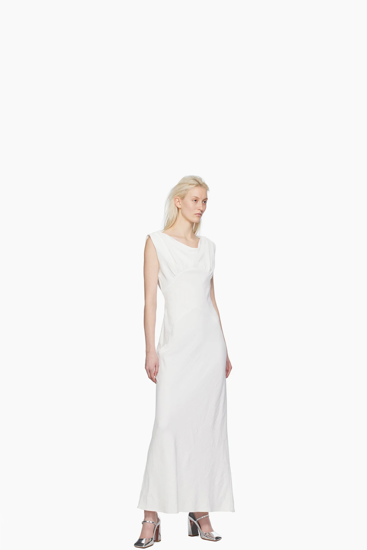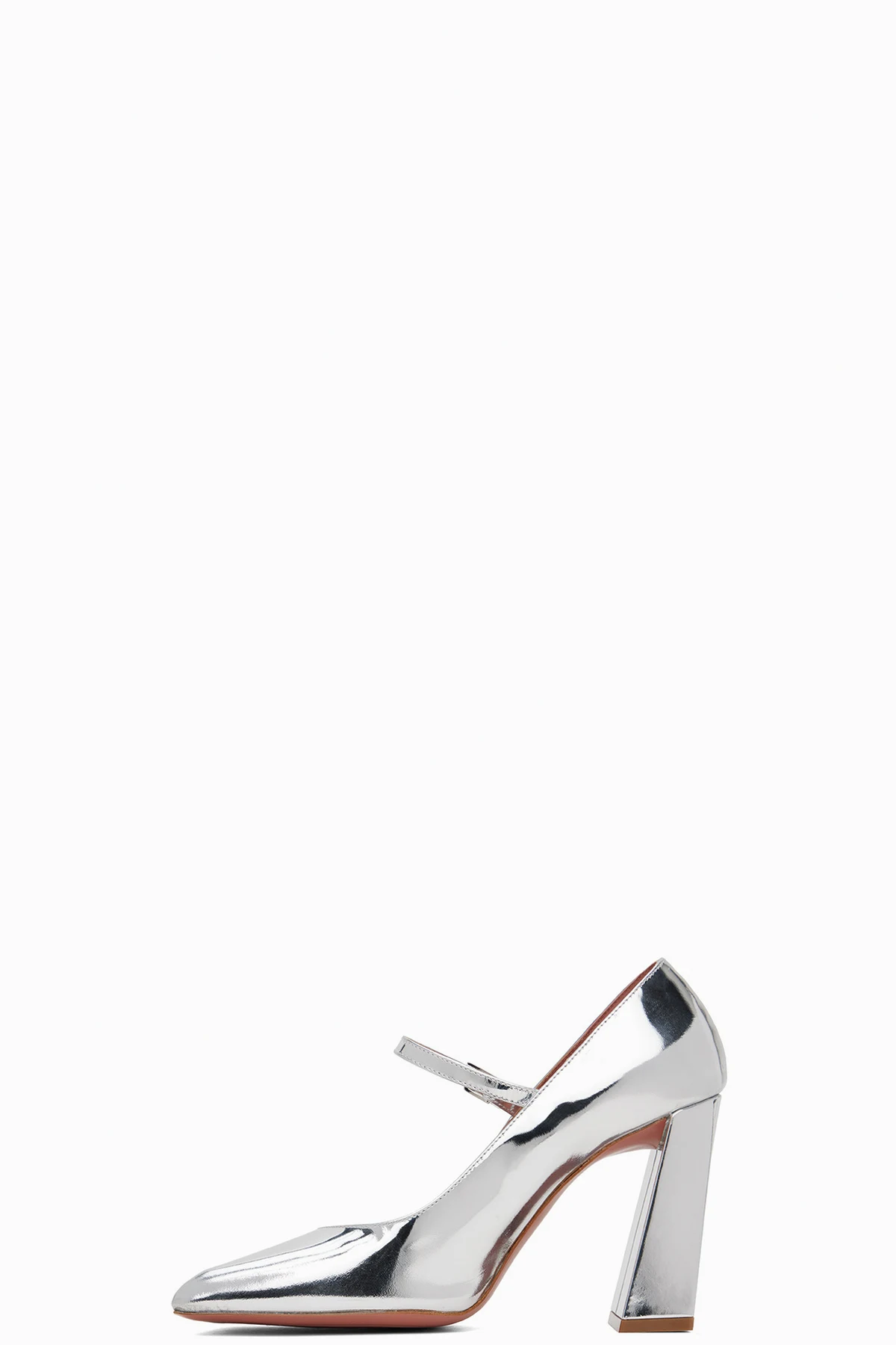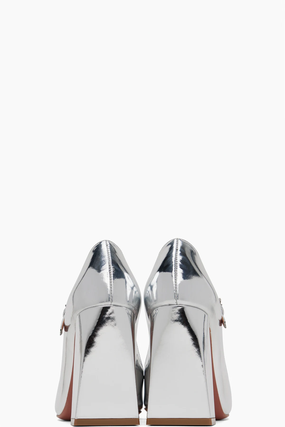 Buffed calfskin Mary Jane-style heels in metallic silver tone.