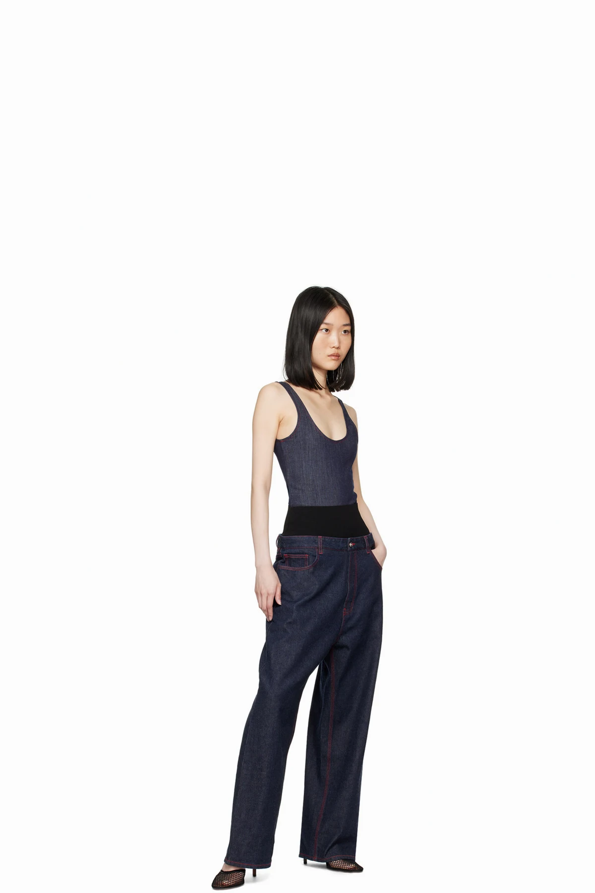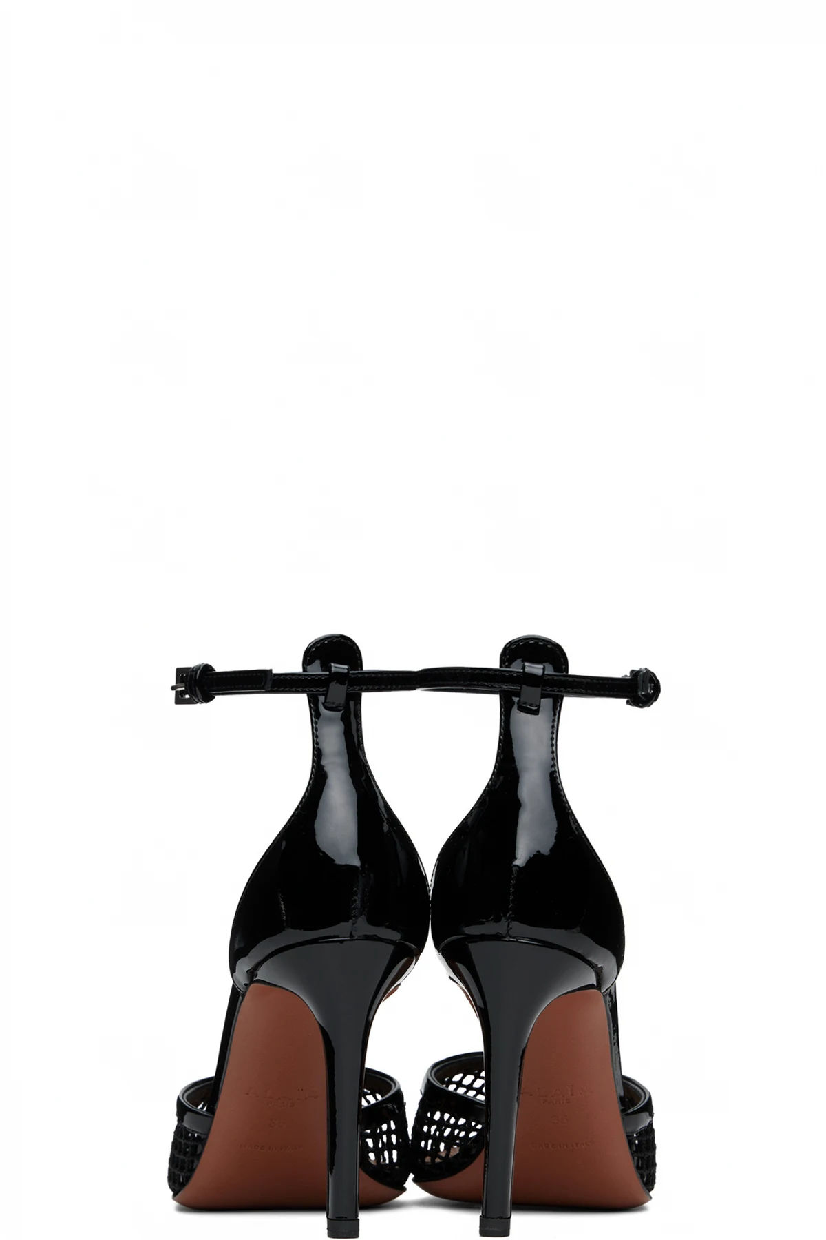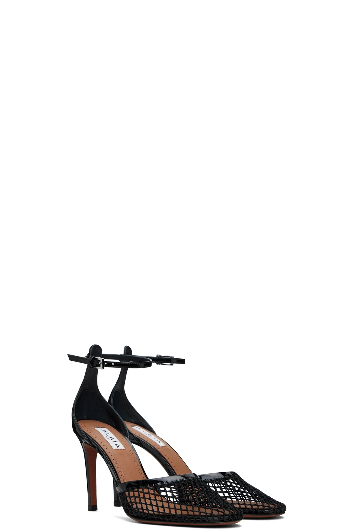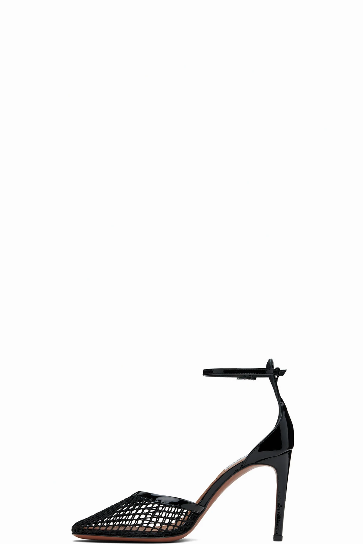 Sheer nylon mesh and patent calfskin heels in black.