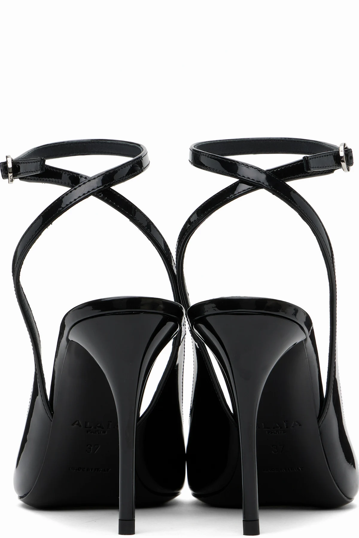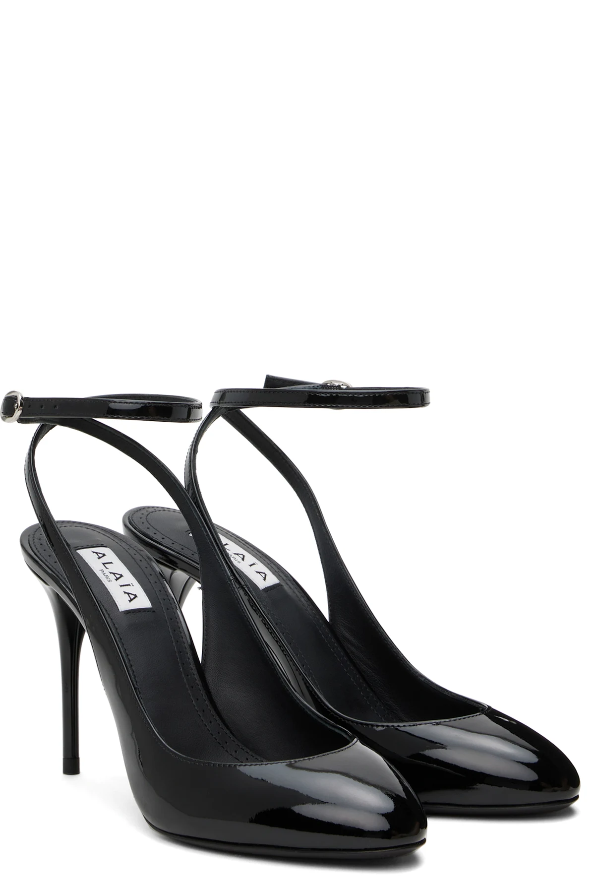 Patent calfskin heels in black.