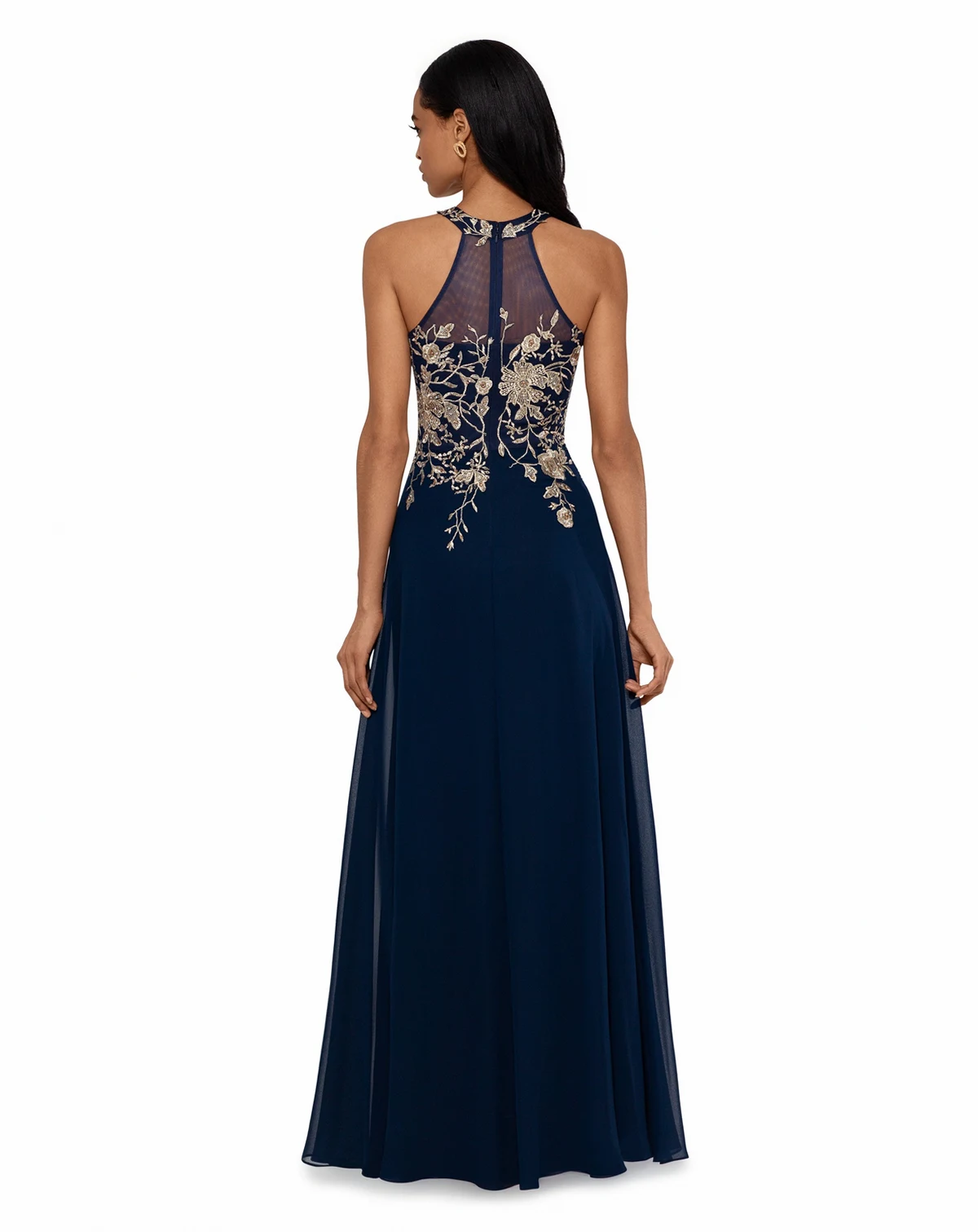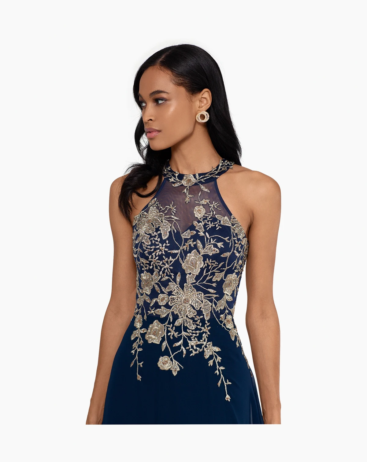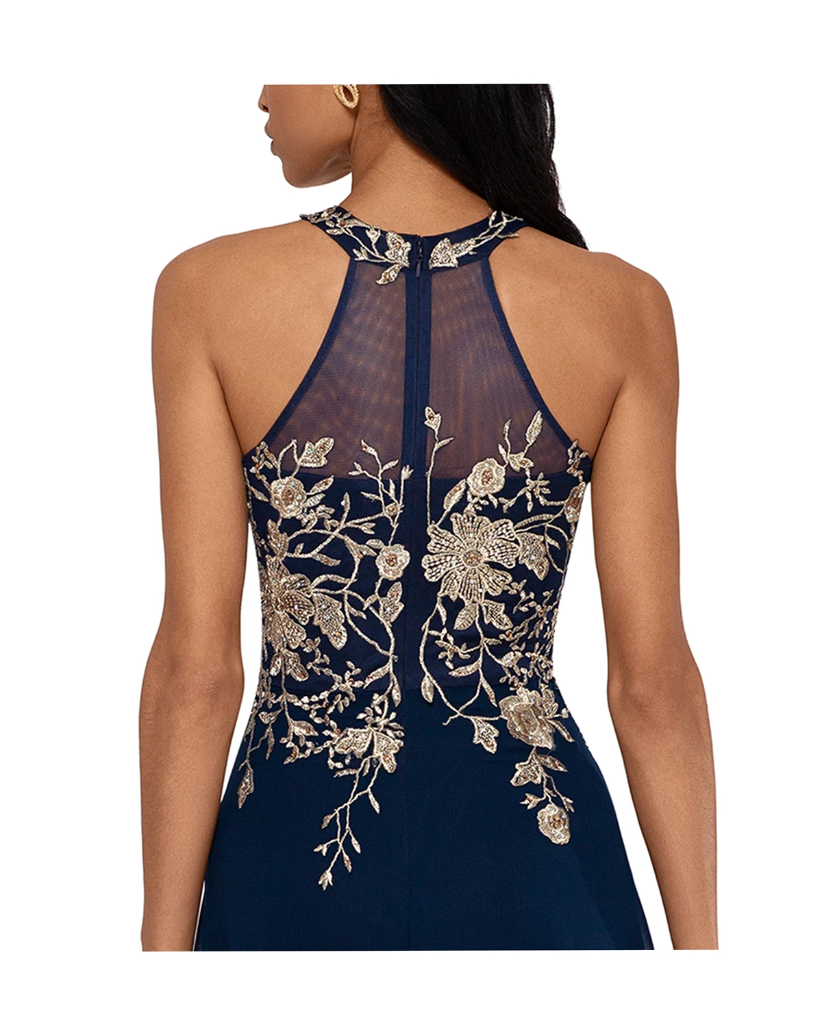 Shell: polyester; appliqué: polyester; mesh: polyester; chiffon skirt: polyester; lining: polyester; IMPORTANT NOTE: This item arrives with a return tag attached and instructions for removal. Once the tag is removed from the dress, this item cannot be returned.