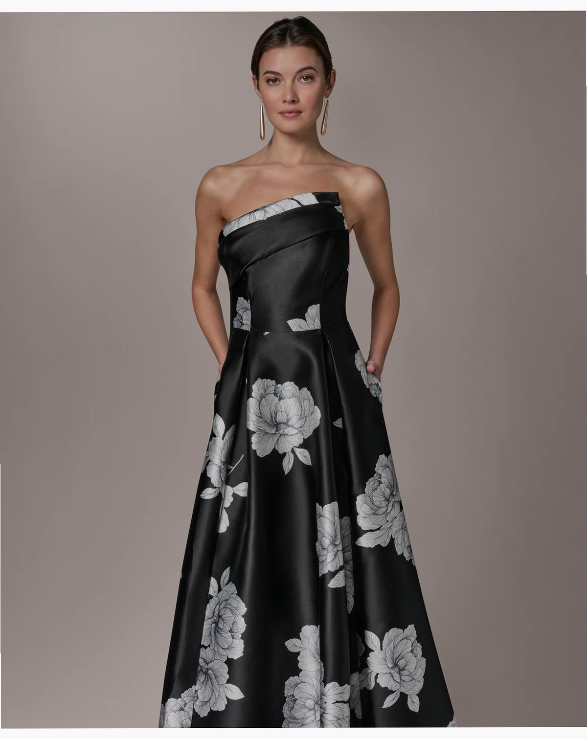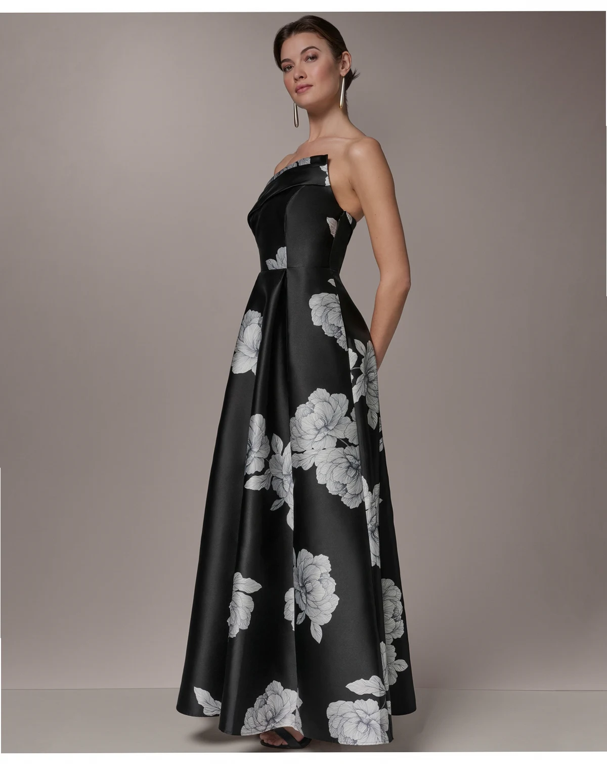 Make a stunning entrance in this Donna Karan ball gown, featuring an asymmetrical neckline and sleeveless design for a modern, elegant silhouette. The waist seam zipper closure ensures a flawless fit, while functional pockets add a practical touch. The long length exudes formal sophistication, making it a suitable choice for any upscale occasion.