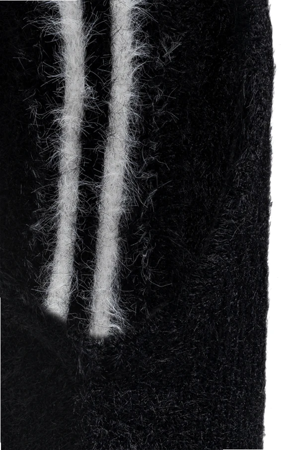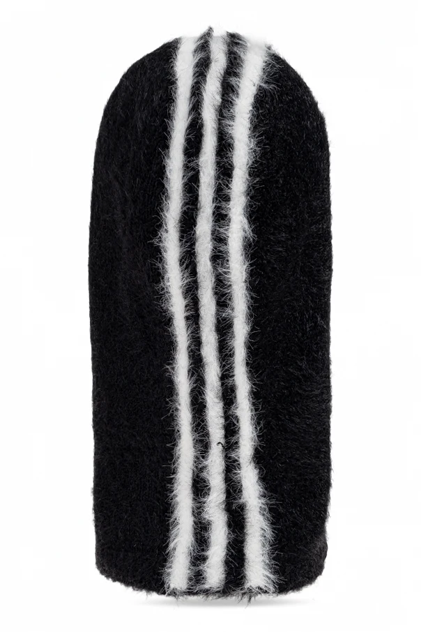 Distinctive parallel white stripes extend dramatically from the forehead, curving elegantly to reveal three iconic stripes at the back—a subtle yet bold ode to Adidas' legendary design legacy. The tactile, slightly fuzzy knit delivers both insulation and a refined, exclusive touch, harmonizing effortlessly with the sophisticated codes of luxury streetwear.