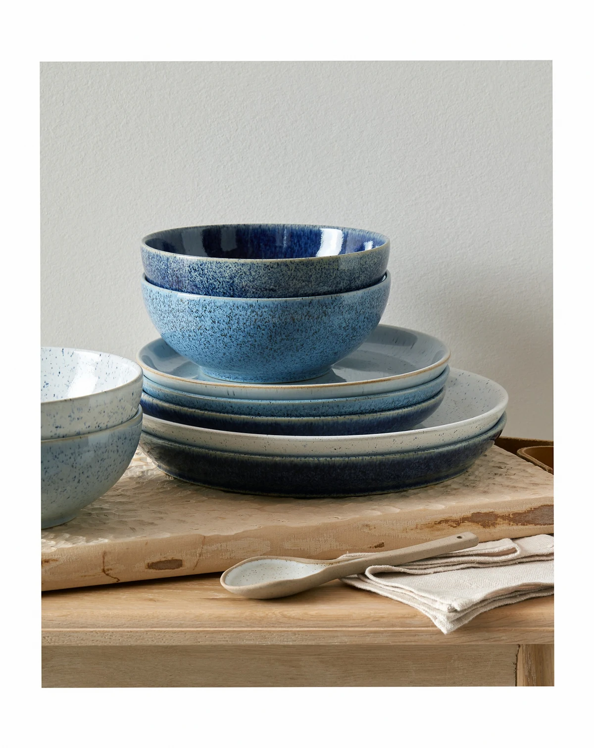 The upturned edges of Denby's Studio Blue medium coupe plate set stylishly accommodate salads or accent desserts in an array of speckled shades.