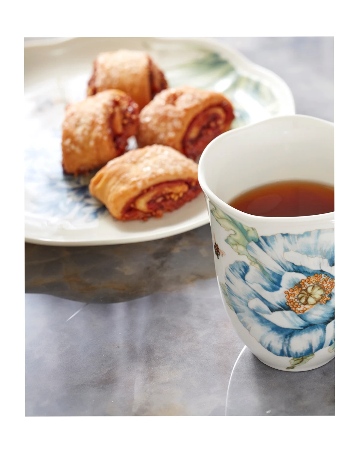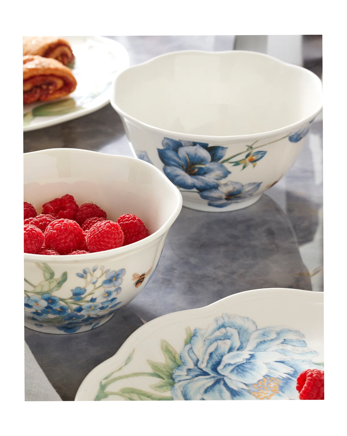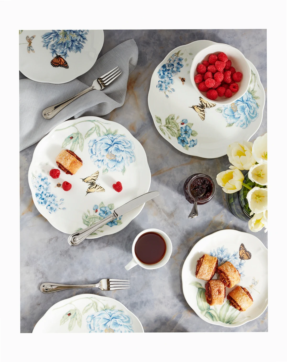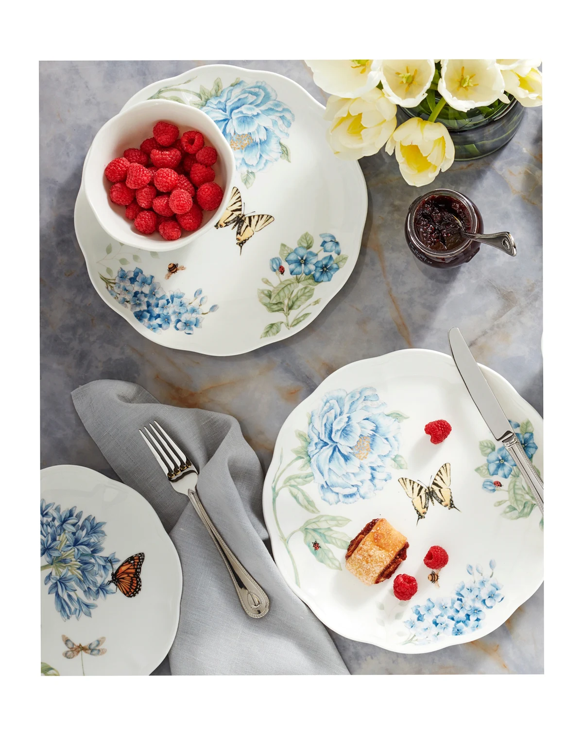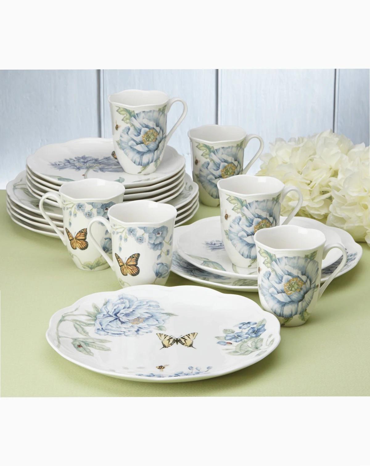 Now in bloom. The Butterfly Meadow Blue place setting from Lenox features the sturdy, scalloped porcelain of original Butterfly Meadow dinnerware but with oversized peonies, roses and other new blossoms in shades of blue.