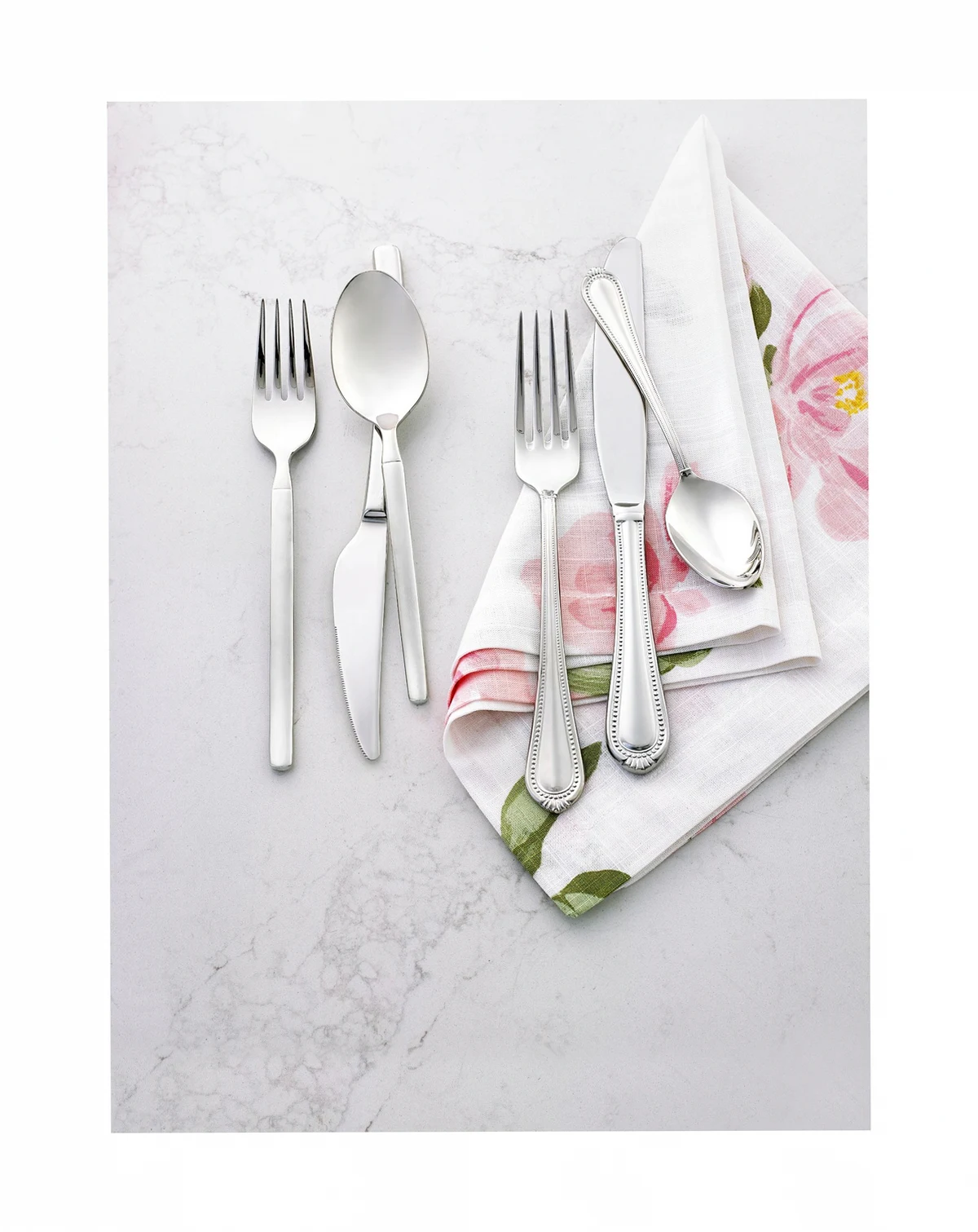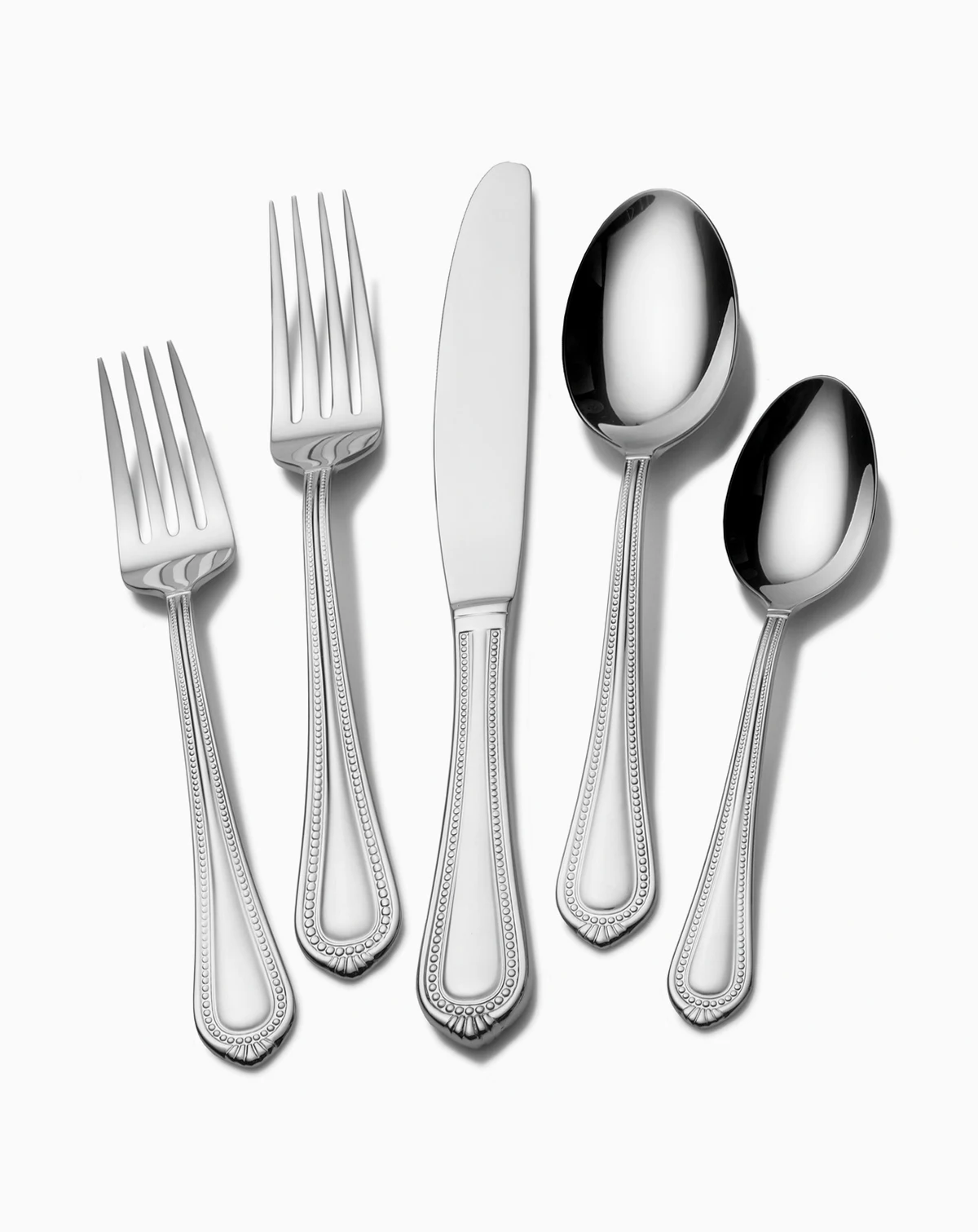Classically styled, the Regent Bead flatware set transitions beautifully from everyday meals to finer occasions in polished, top-quality stainless steel. Scallop and beaded detail define service for twelve with ageless elegance. From Mikasa.
