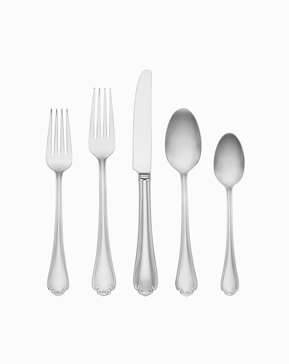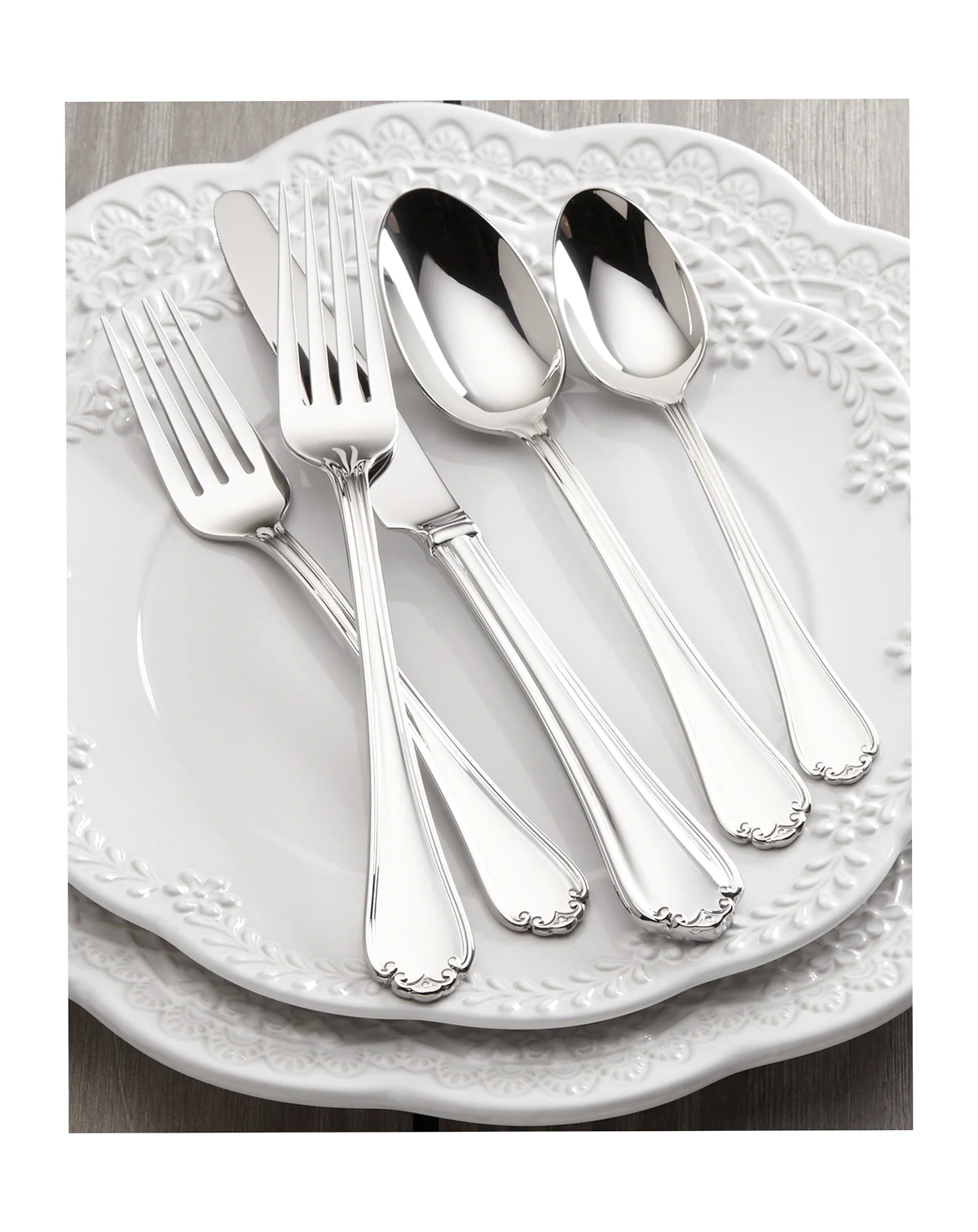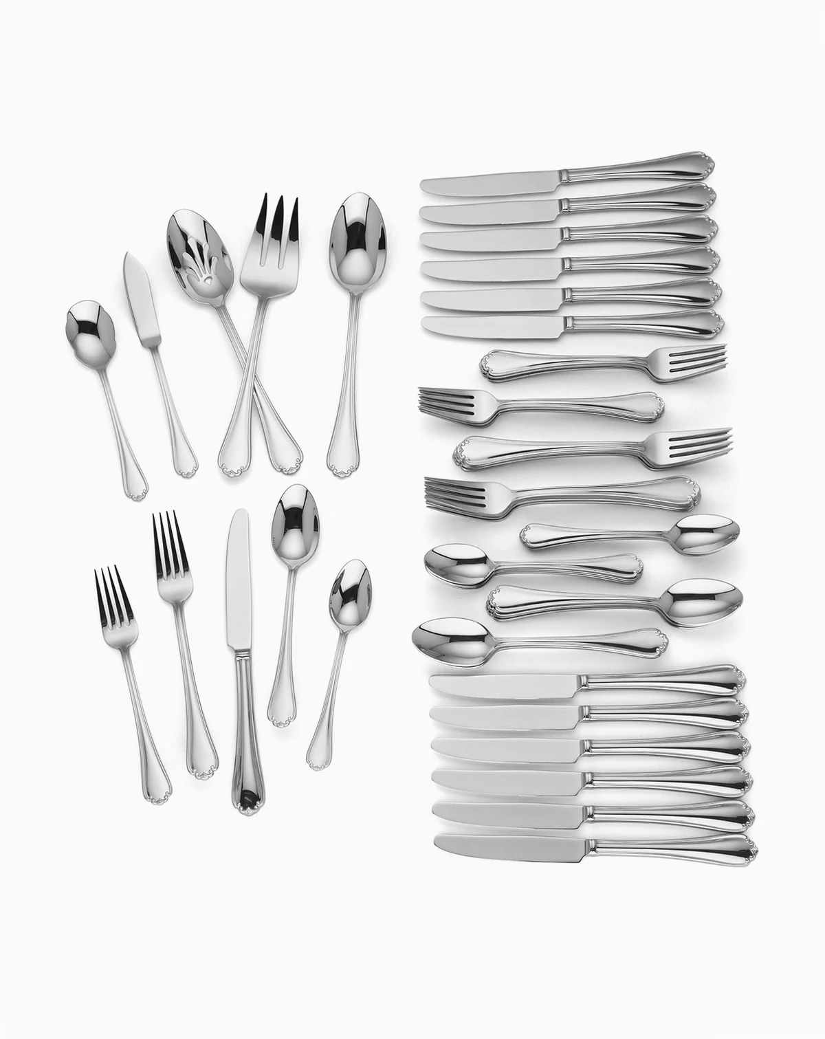 Sophisticated and modern elements provide a stylish update to a classic design in the Chelse Muse flatware pattern from Lenox. The set includes service for twelve along with elegant and useful service pieces. The Chelse Muse flatware set features a scalloped design along the bottom of the handle, inspired by floral motifs. Crafted from brilliant 18/10 stainless steel, this high-quality flatware set is both durable and dishwasher safe, making it ideal for everyday use. This large set has everything you need in one and can be used for both casual and formal occasions.