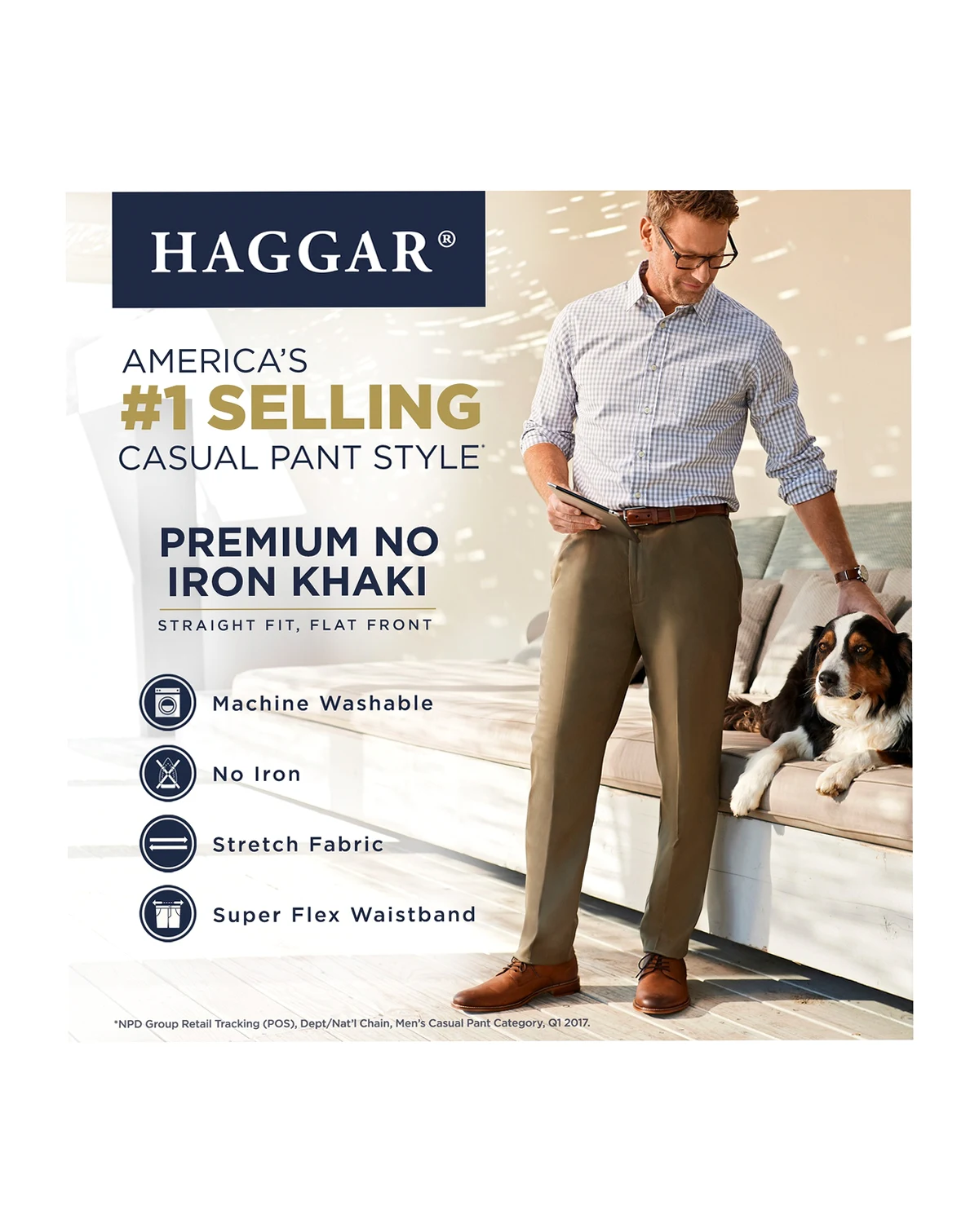 Offering a non-iron design and a comfortable straight fit, these Haggar premium stretch flat-front pants are a smart choice for out-of-town meetings and long days at the office.