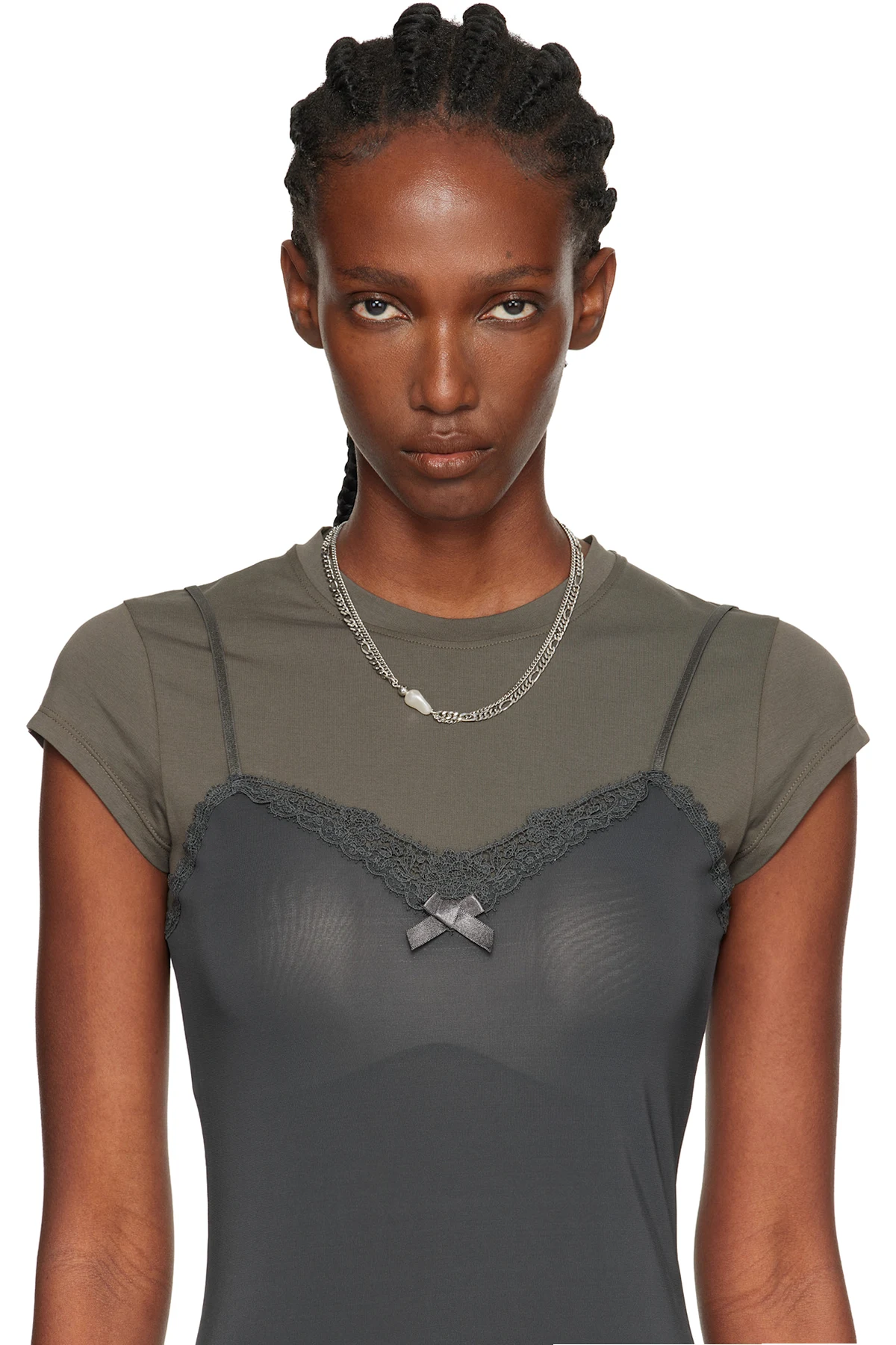 Handcrafted tiered curb chain necklace in palladium-plated brass.
