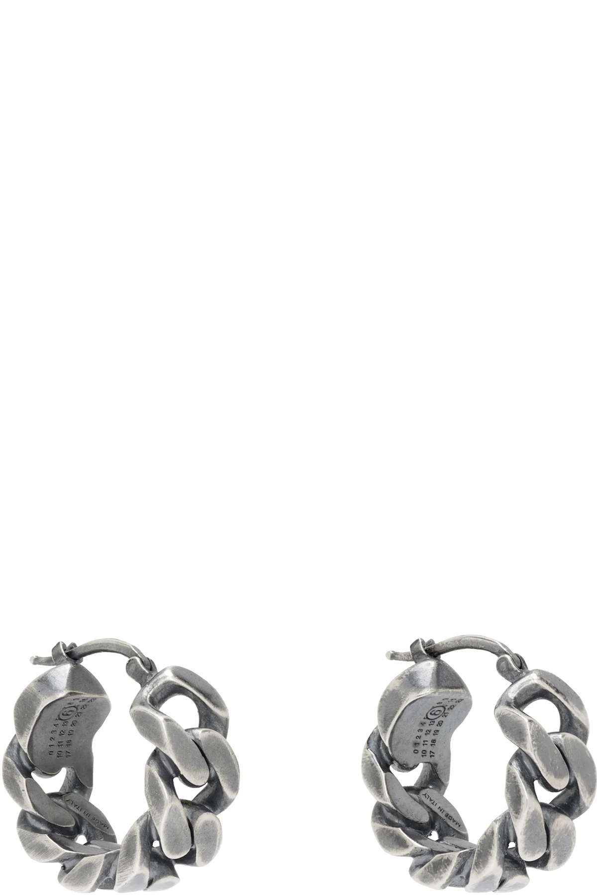 Pair of fixed curb chain hoop earrings in antiqued silver-tone brass.