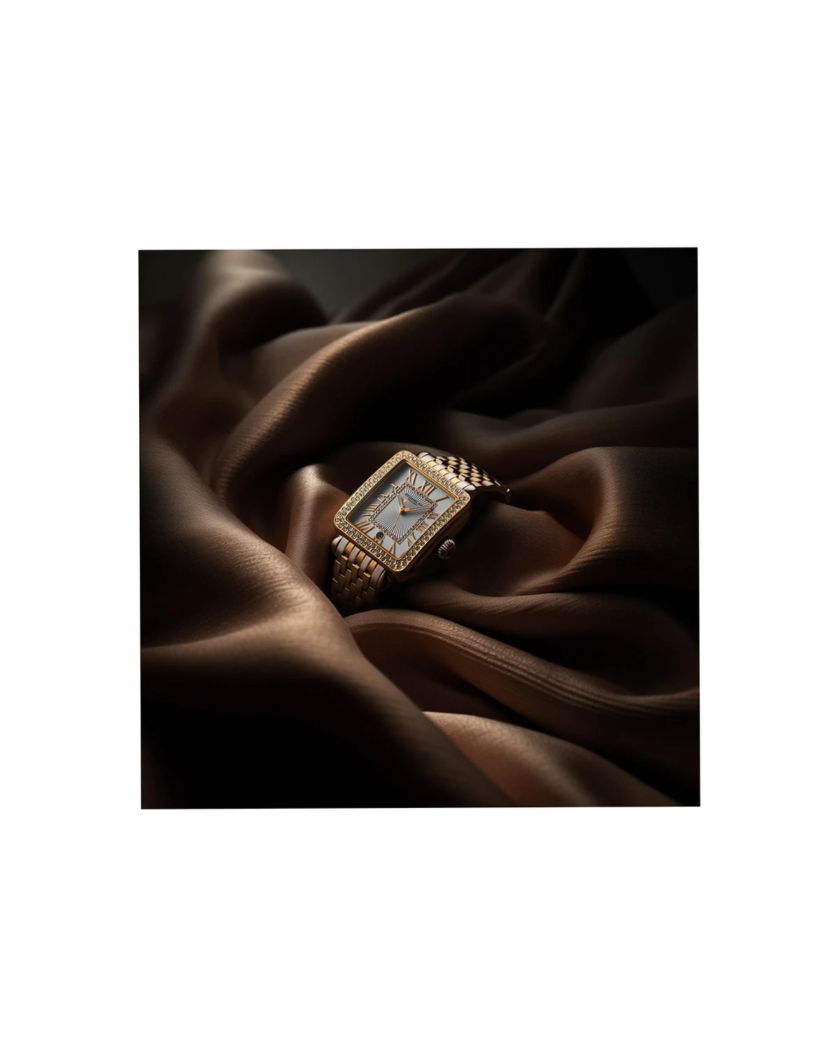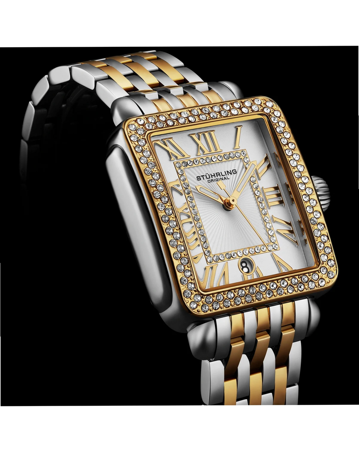 The Stuhrling VivreLuxe blends timeless elegance with modern sophistication, offering a luxury-inspired design at an accessible price. Its 34mm rectangular case, framed by a shimmering crystal-set bezel, captures the essence of refined glamour. The silver-tone dial features bold Roman numeral markers and dauphine-style hands, evoking classic European watchmaking traditions. A faceted red cabochon-style crown adds a distinctive flourish, while the multi-link stainless steel bracelet ensures a comfortable and polished fit. Powered by a reliable quartz movement, the VivreLuxe delivers precise timekeeping with effortless ease. Available in silver, rose gold, or two-tone finishes, this best-selling timepiece makes a statement of sophistication and confidence — perfect for both everyday wear and special occasions.