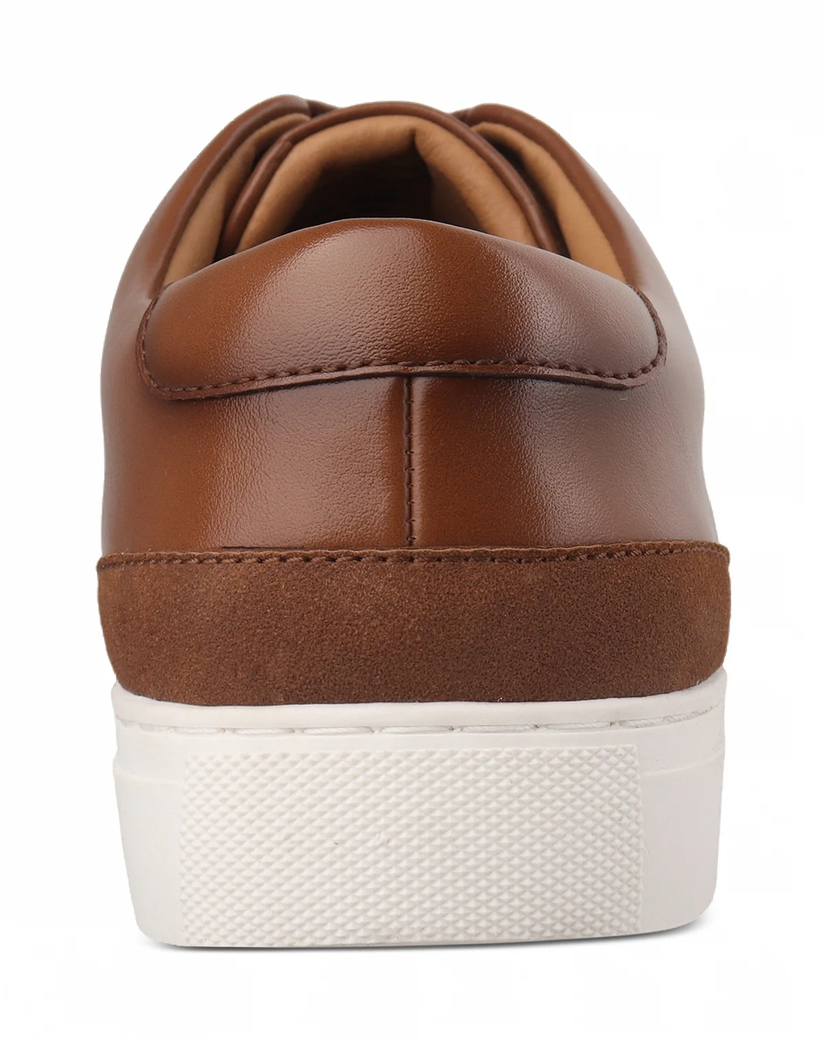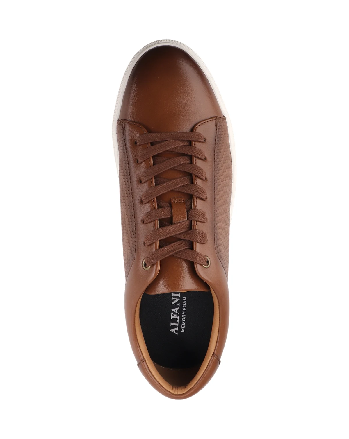 Classic tennis sneaker styling gets a dressy upgrade with the smooth faux leather upper and woven-look quarters of these handsome sneakers by Alfani.