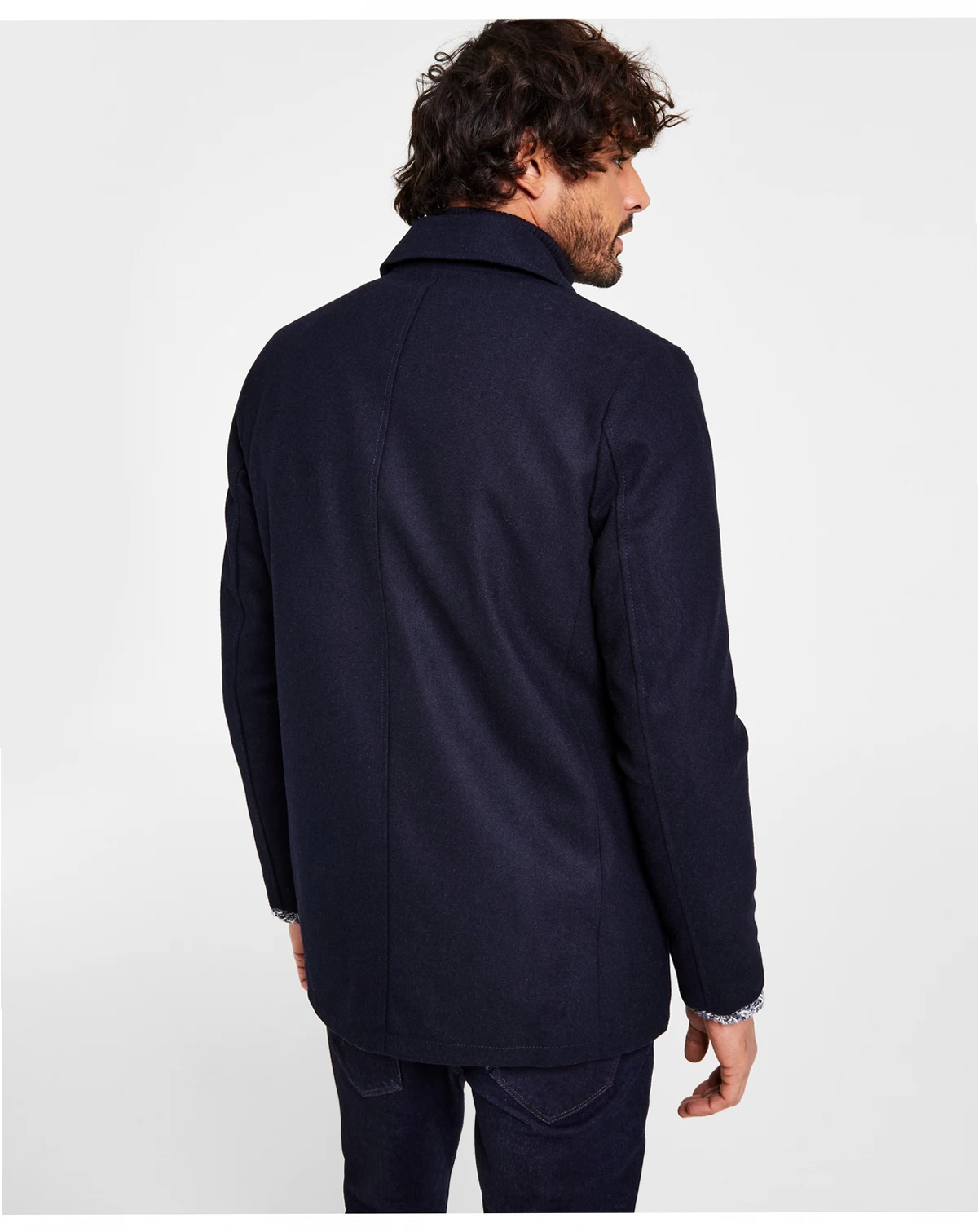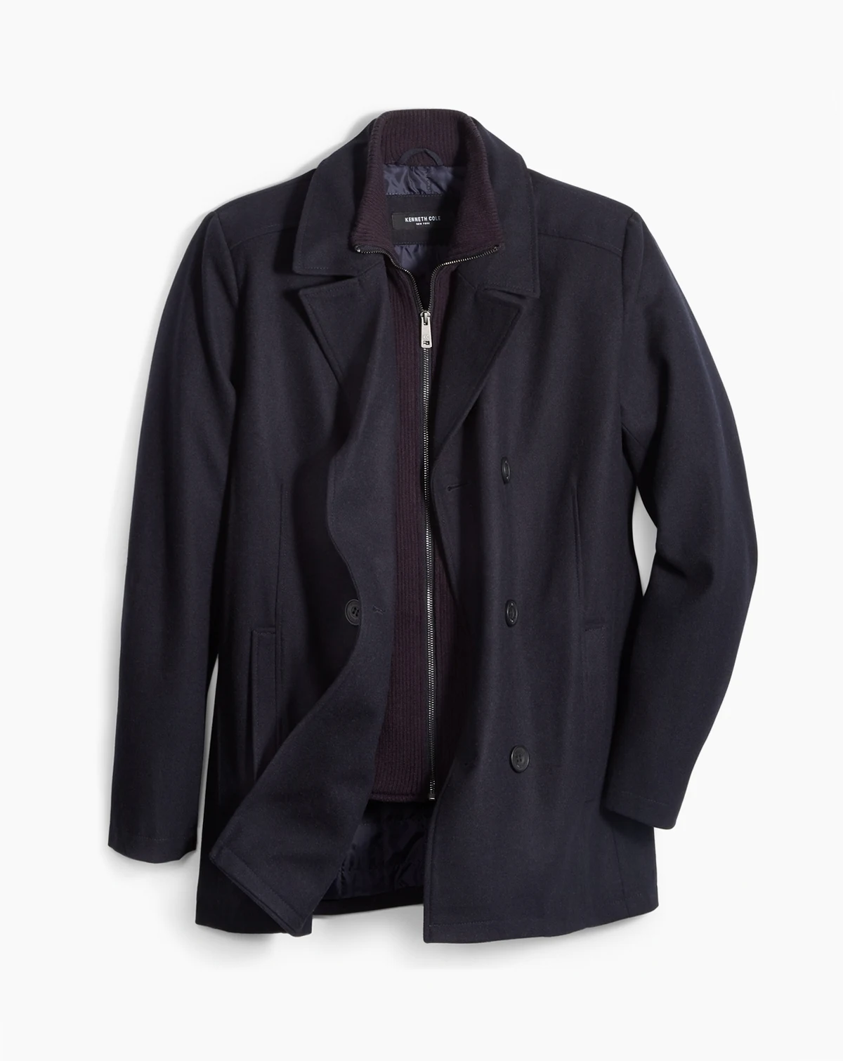 Kenneth Cole delivers a classic finish to your look with this double breasted pea coat, designed with an attached full-zip bib at the interior for added warmth on chilly days.