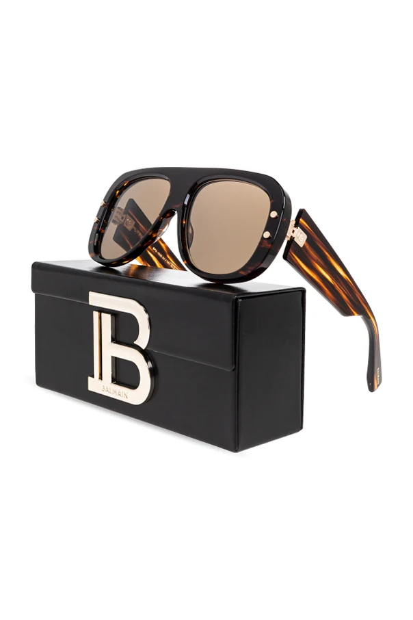 Crafted from lustrous, premium acetate, the substantial frame radiates exclusivity, while six symmetrically placed metallic rivets and wide, sculptural temples add an air of contemporary allure. The hinge showcases a metal accent delicately engraved with the house’s emblem, underscoring Balmain’s commitment to luxurious detailing.