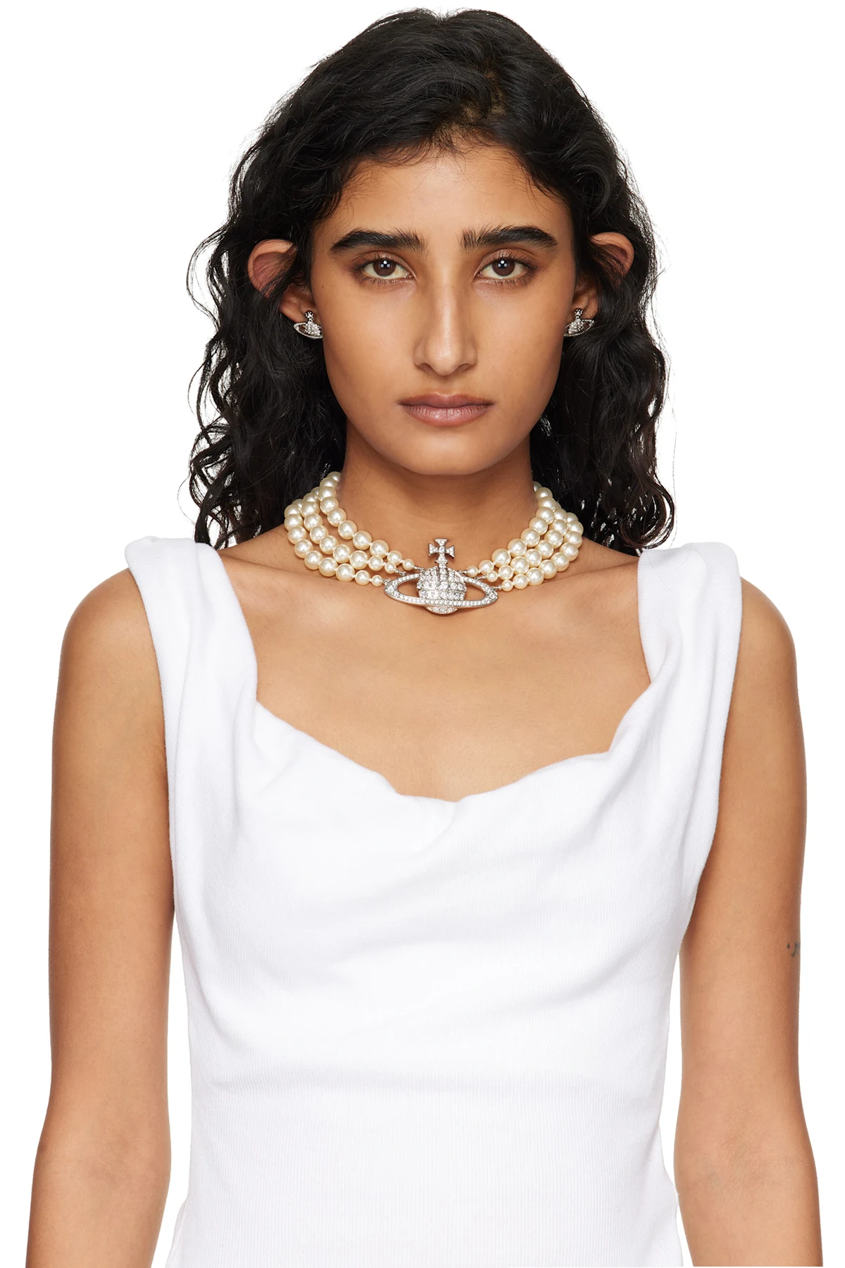 Tiered beaded faux-pearl necklace in white.