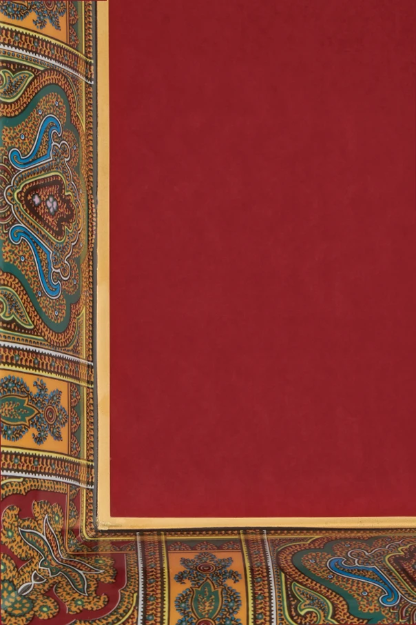 A striking paisley motif in ornamental green, blue, gold, and burgundy elegantly frames the deep, rich crimson center, which is further accentuated by a bold gold border. This thoughtful embellishment infuses the piece with both opulence and distinction, while the absence of visible logos preserves its understated allure.