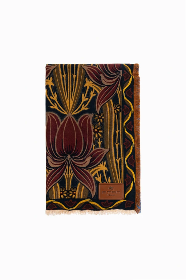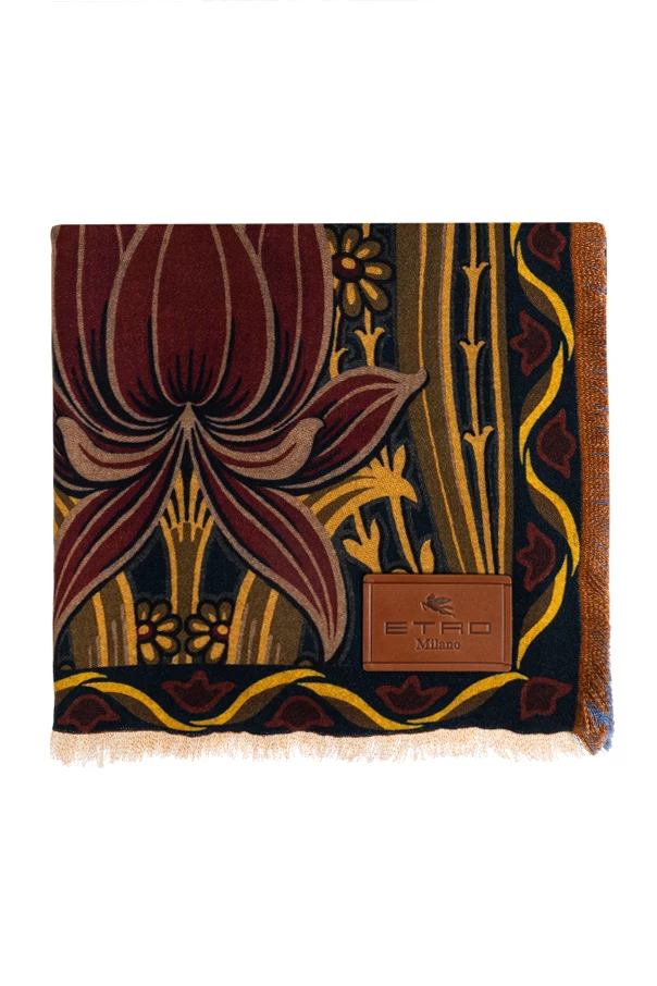 Envelop yourself in exquisite comfort with this Patterned Throw Blanket by Etro Home , a sophisticated statement of timeless refinement. Crafted from luxurious, sumptuously soft wool, its classic rectangular shape is adorned with an elaborate, symmetrical floral motif—bold stylized blooms in burgundy, yellow, gold, and olive , enriched by botanical accents and framed in tasteful geometry. The striking multicolor palette is masterfully balanced by delicate black accents and a contrasting blue background revealed along the turned edge, creating a captivating visual harmony.