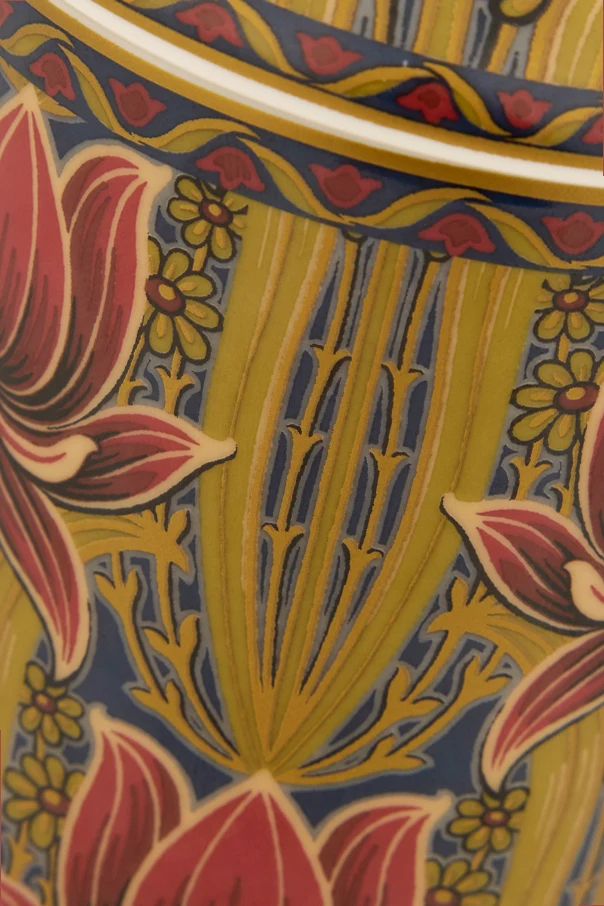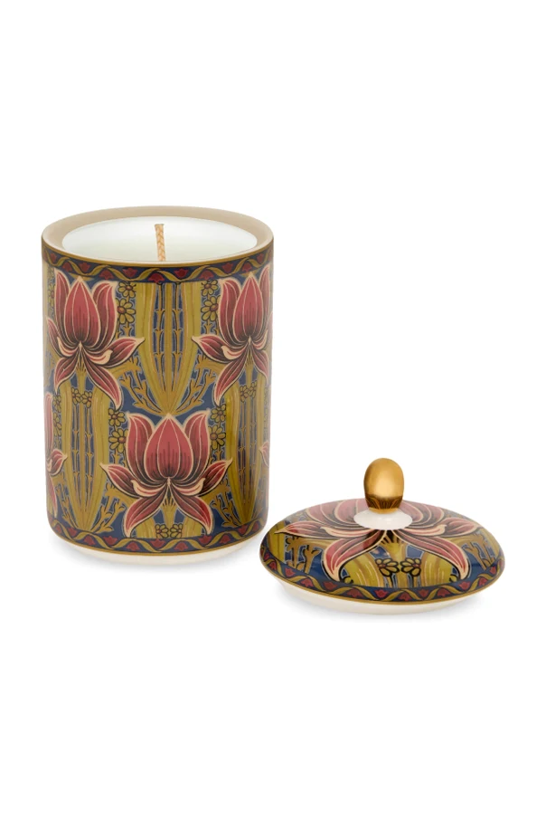 Envelop your senses and space in the refined artistry of the Etro Home Porcelain Candle . Housed in a sumptuous, satin-glazed porcelain vessel, this cylindrical masterpiece is adorned with lavish botanical motifs—flourishing lotus flowers rendered in rich shades of pink and crimson, gracefully detailed with gold-yellow and deep navy accents. Each intricate design is meticulously crafted, transforming the candle into a captivating objet d’art.