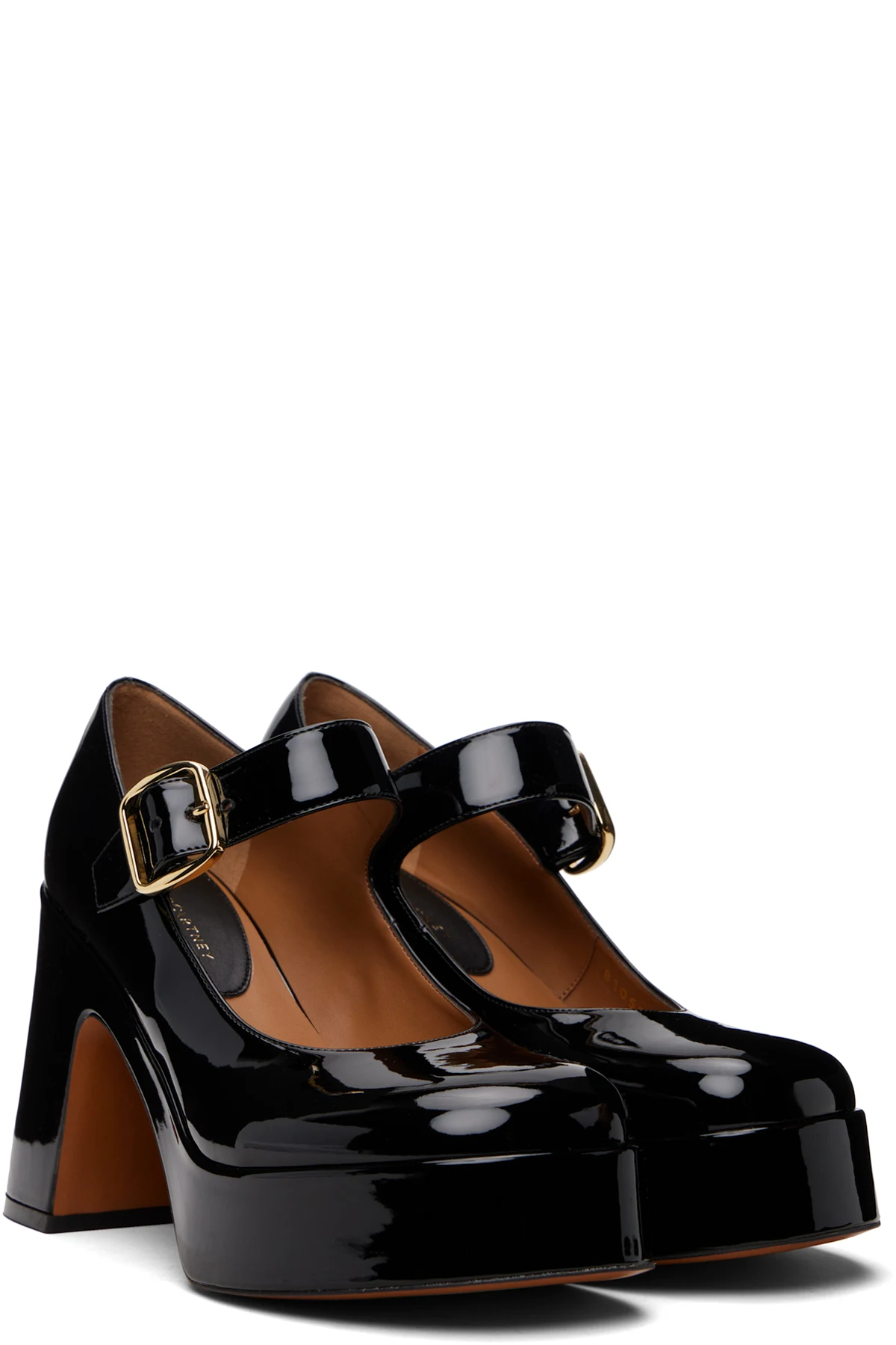 Handcrafted patent faux-leather heels.