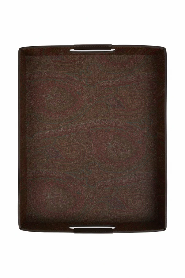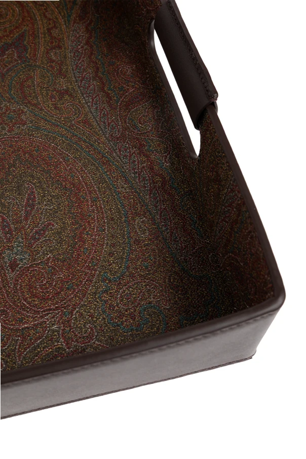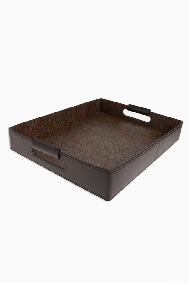 Experience sophisticated living with this rectangular tray in rich brown , thoughtfully crafted by Etro Home . Merging refined aesthetics and paramount function, this exquisite accessory features precisely cut, elevated sides with integrated handles—delicately stitched to ensure both durability and effortless transport.