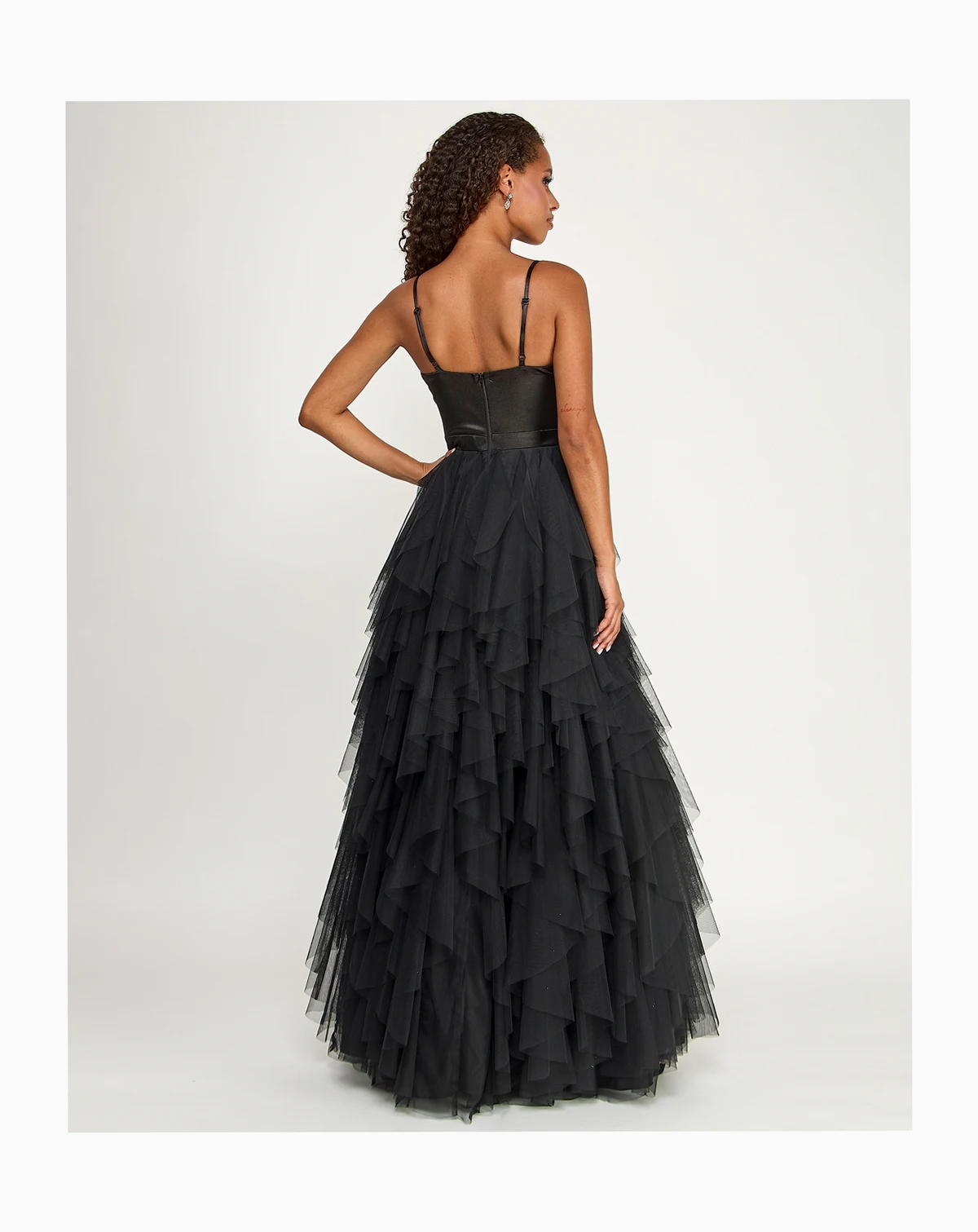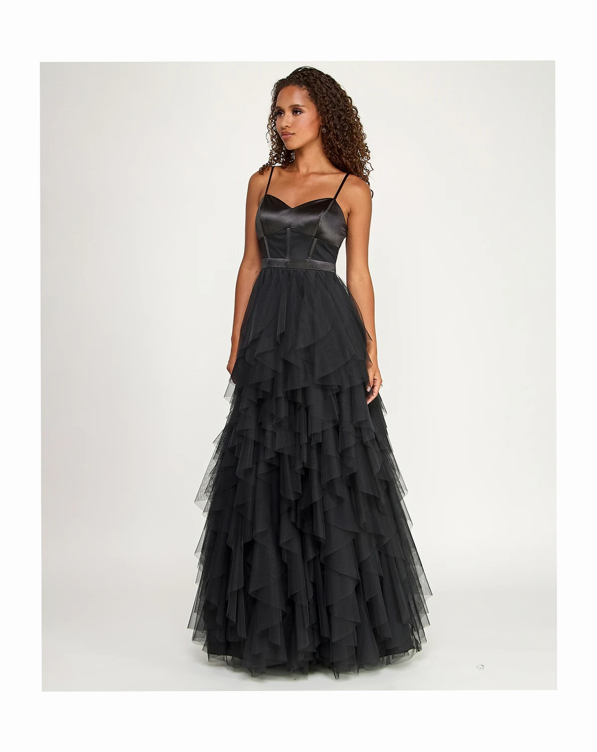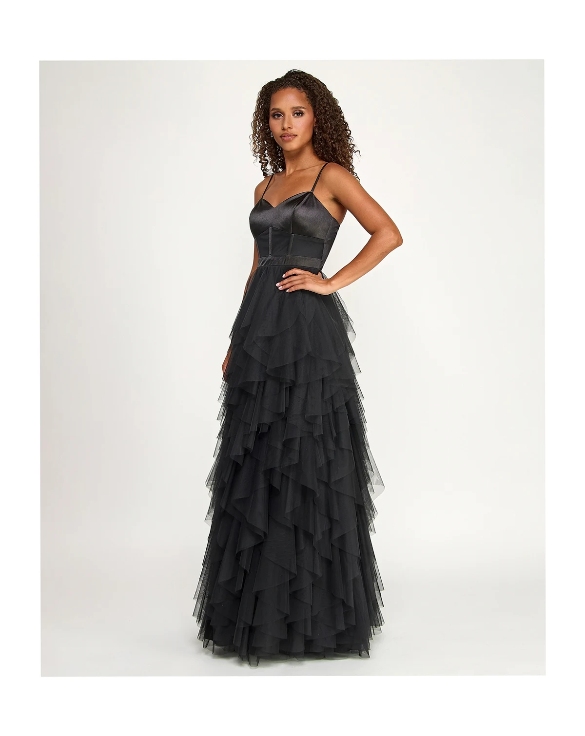 You'll look like you're floating on air when you breeze into the room in this flowing juniors' ruffled gown from City Studios.