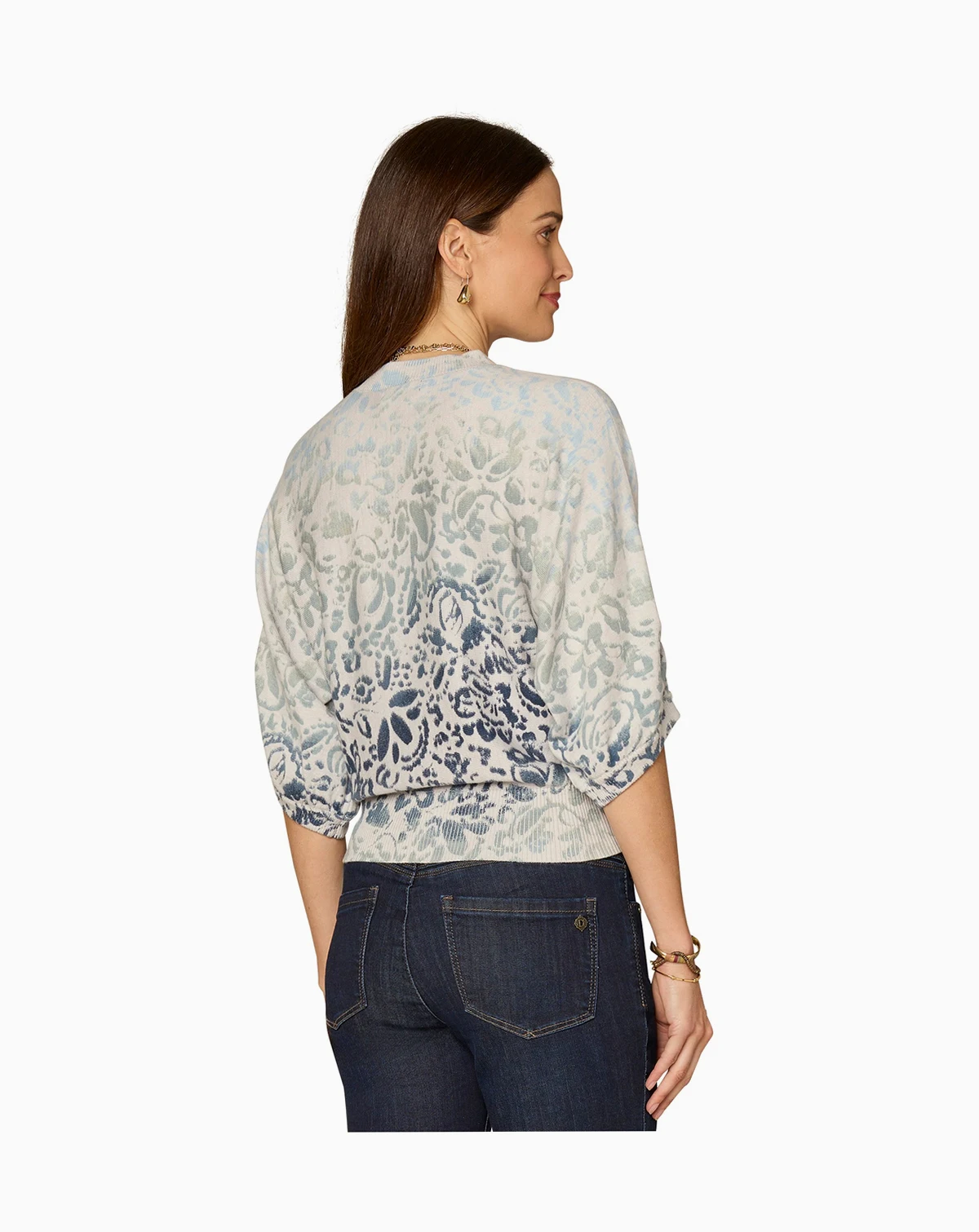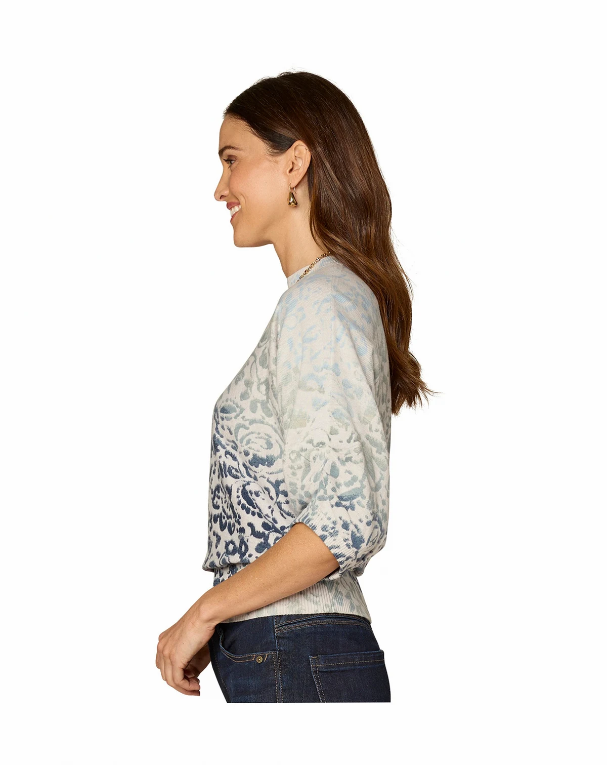 Simple yet elegant, this Democracy sweater features a printed design with 3/4-dolman blouson sleeves and a banded bottom. The relaxed fit and round neck offer comfortable, casual styling.
