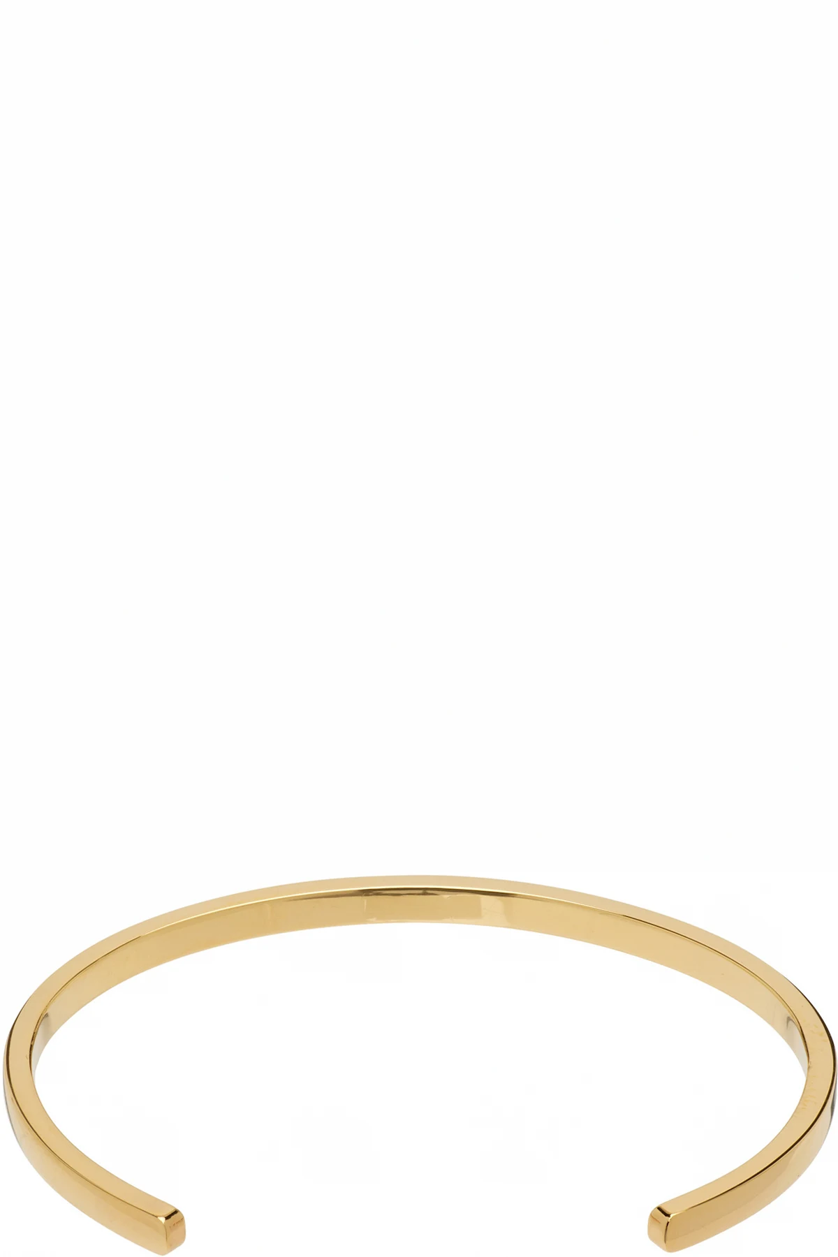 Open cuff bracelet in polished gold-tone brass. Logo engraved at face.