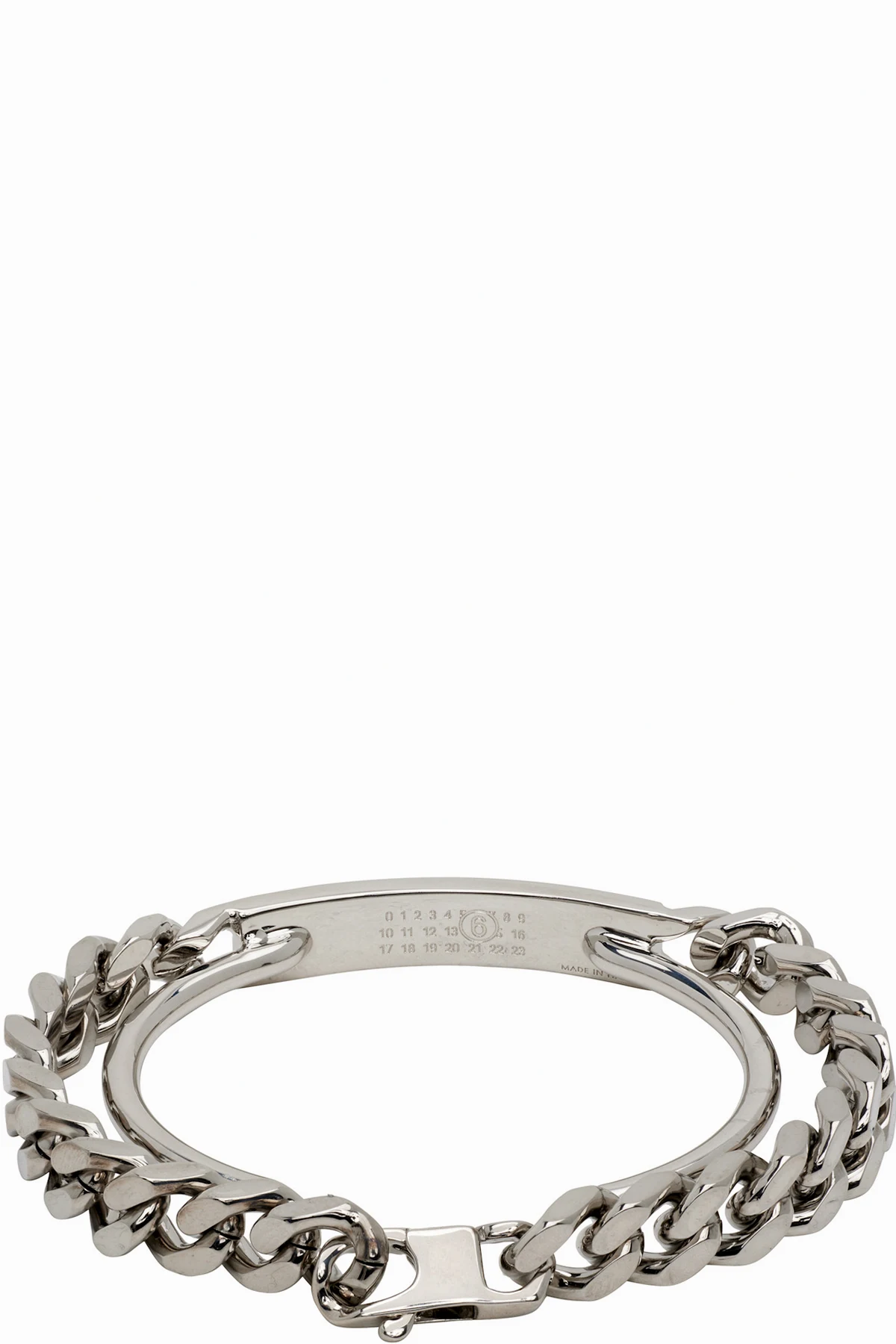 Tiered open cuff and curb chain bracelet in polished silver-tone brass.