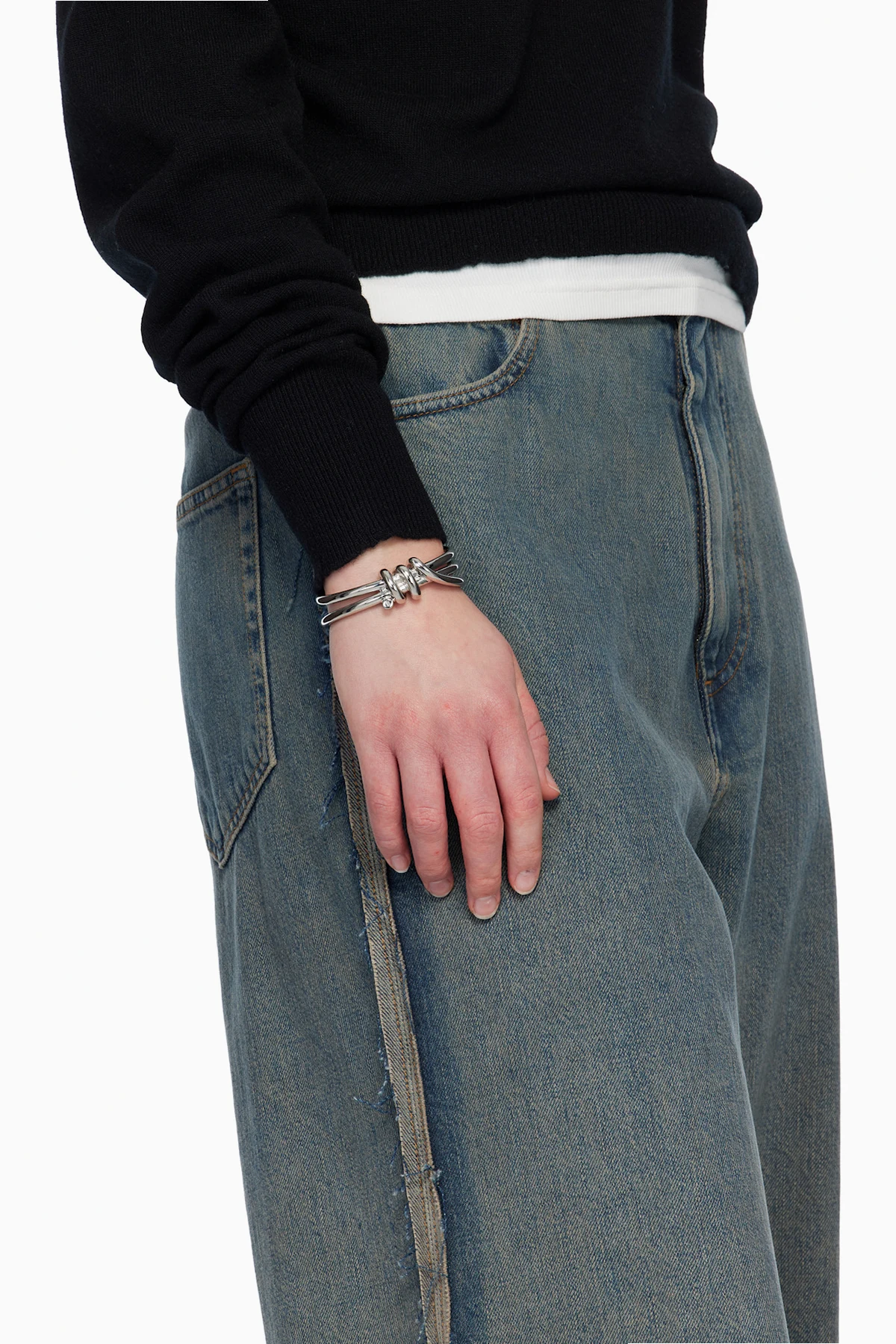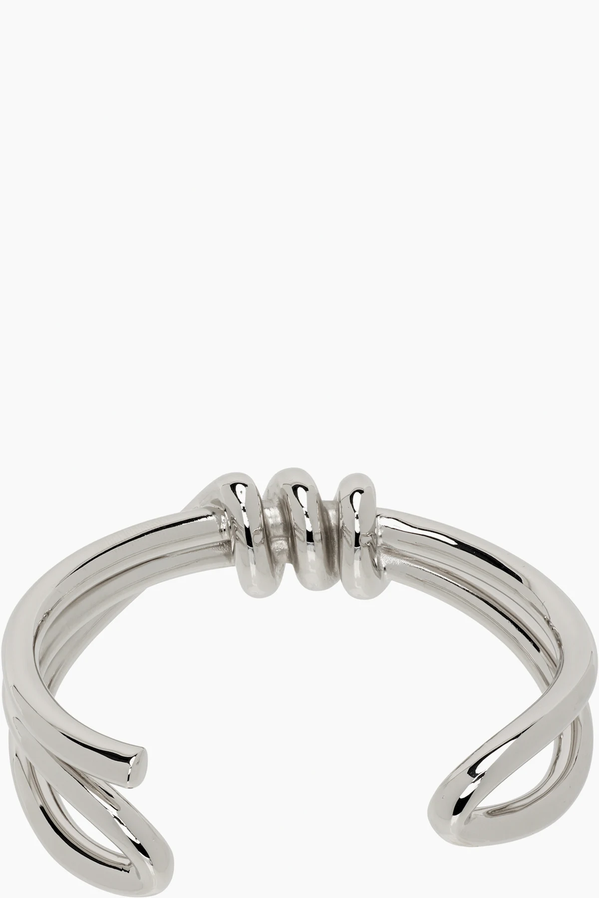 Open-cuff bracelet in silver-tone brass. Knotted detailing at face.