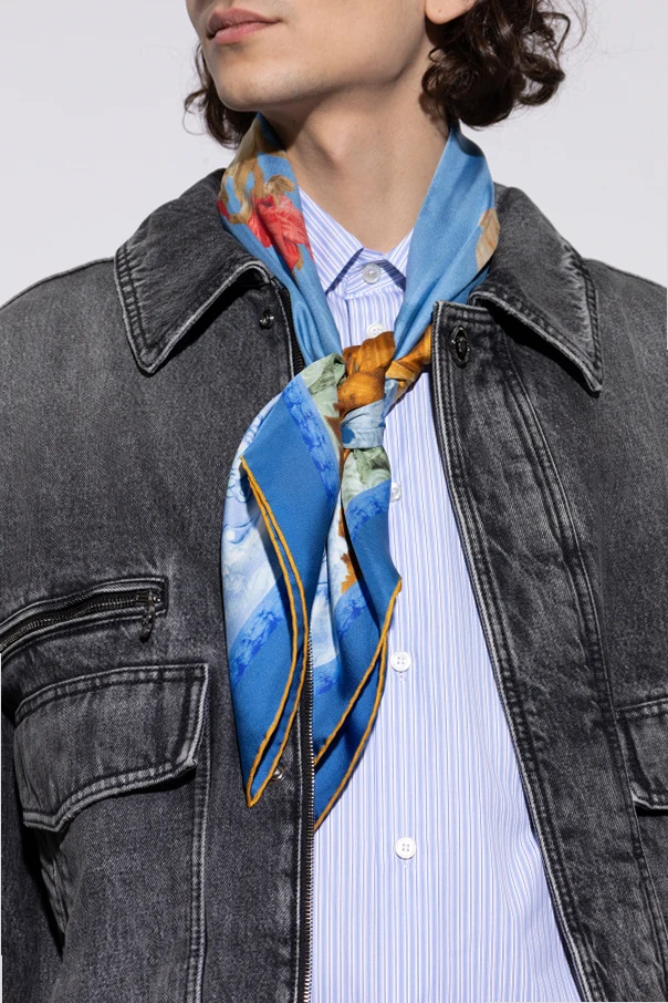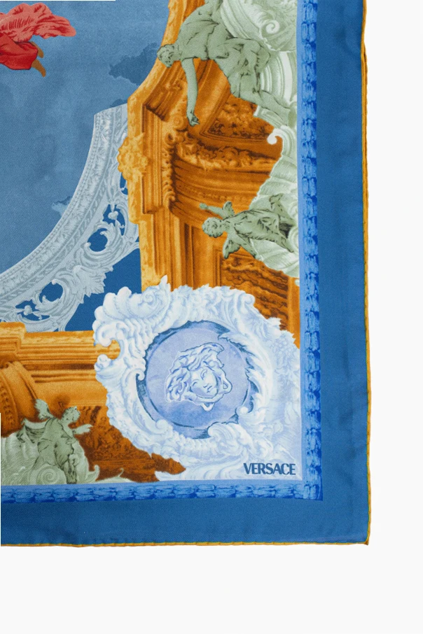 Luxuriously woven from premium silk, this scarf offers a subtle, luminous sheen and a refined, fluid drape. The edges are meticulously hand-finished in a striking blue tone, perfectly framing the intricate composition. Artistic figures and ornamental accents amplify its opulent character, while a discreet Versace logo in one corner affirms authenticity.