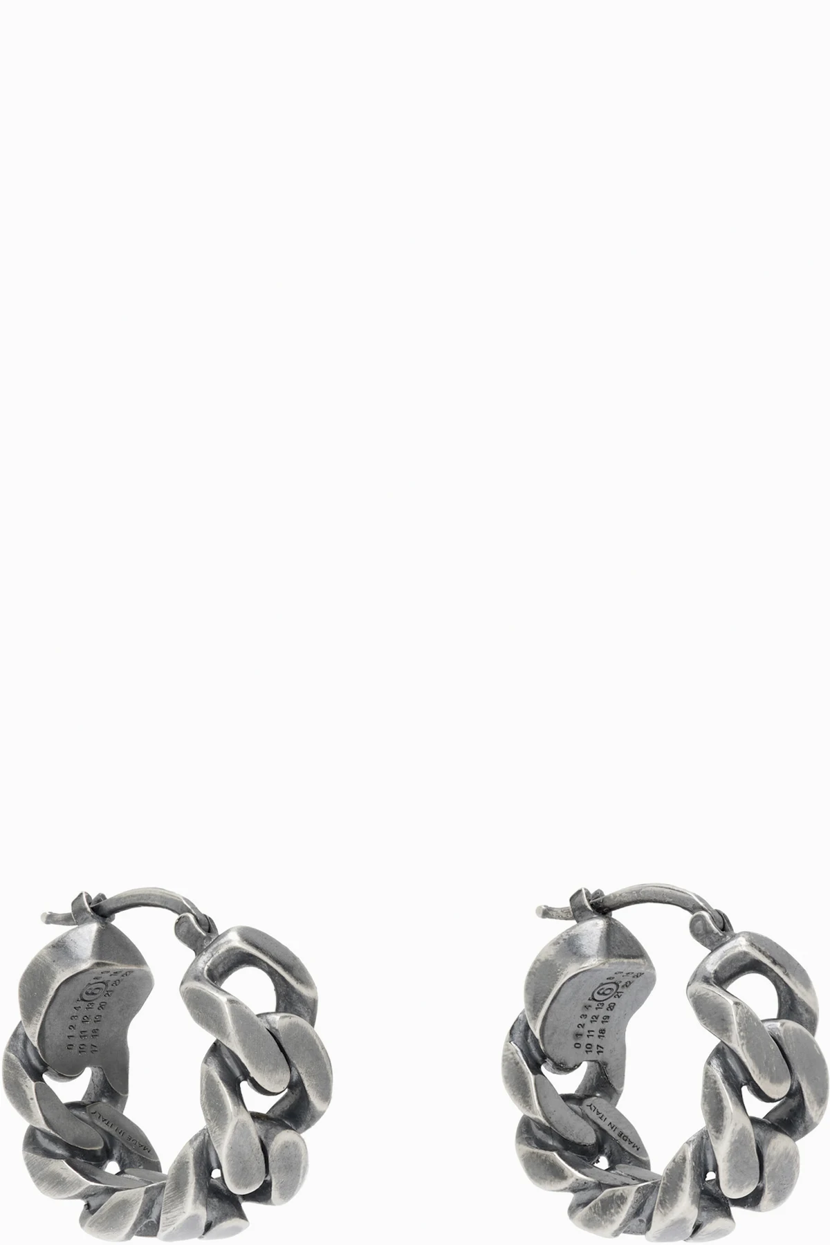 Pair of fixed curb chain hoop earrings in antiqued silver-tone brass.
