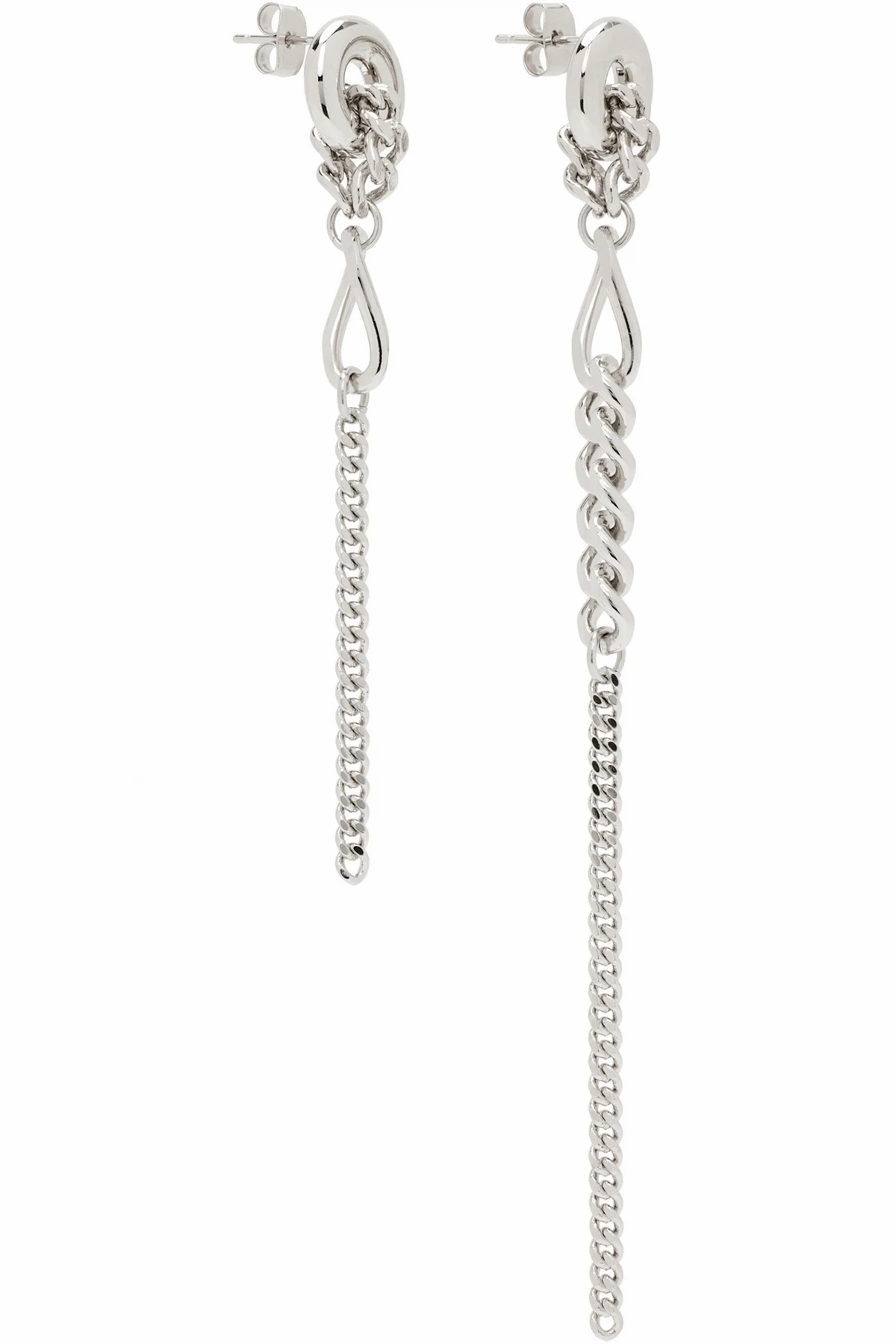 Pair of handcrafted and mismatched drop earrings in palladium-plated brass.
