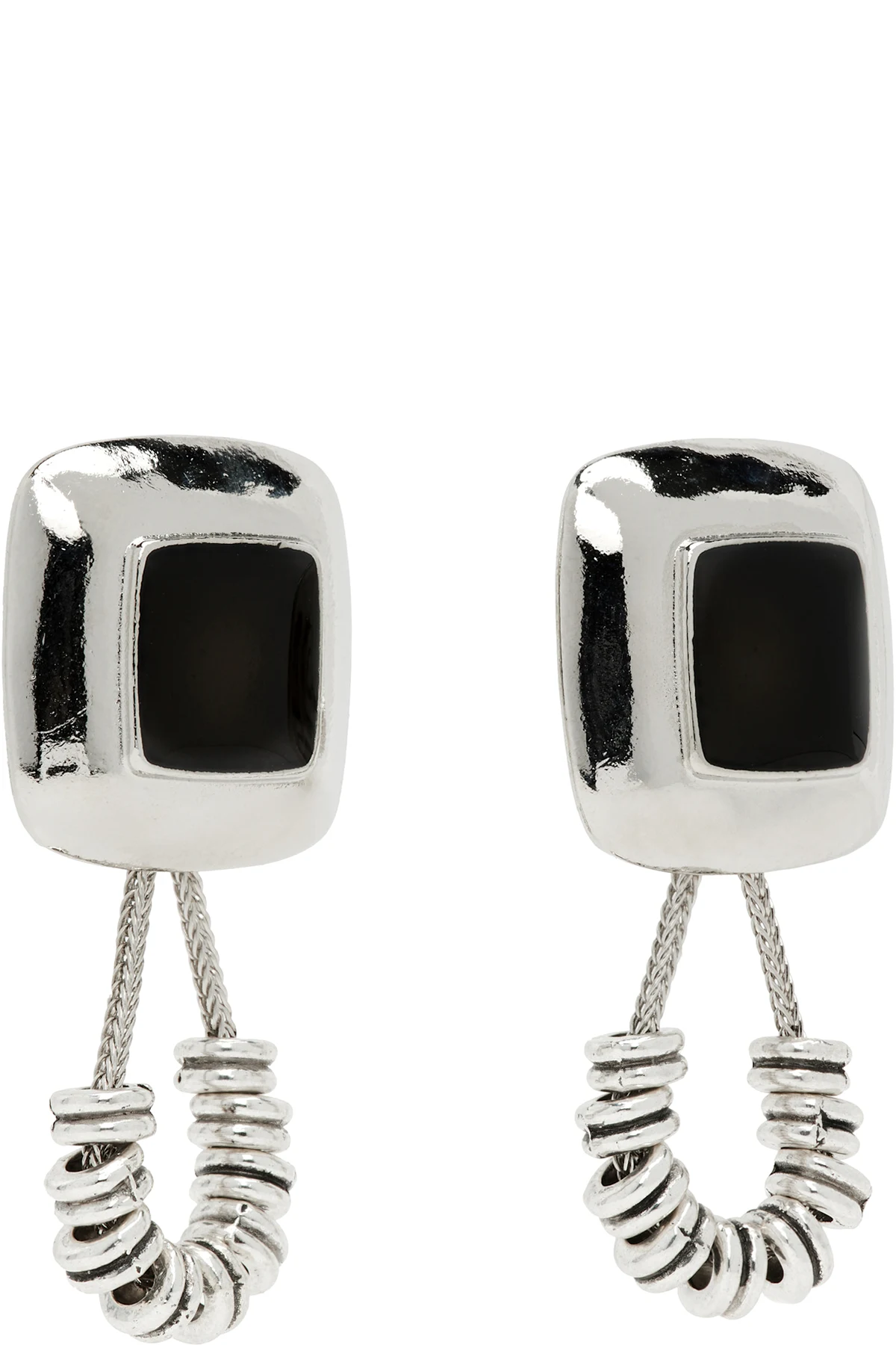Pair of drop earrings in silver-tone metal.