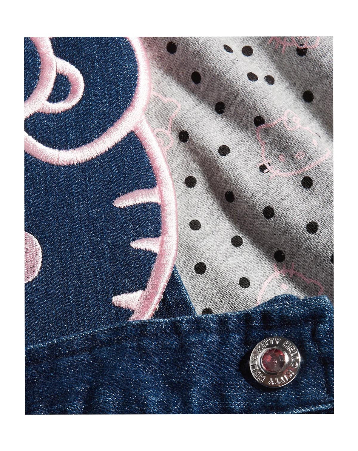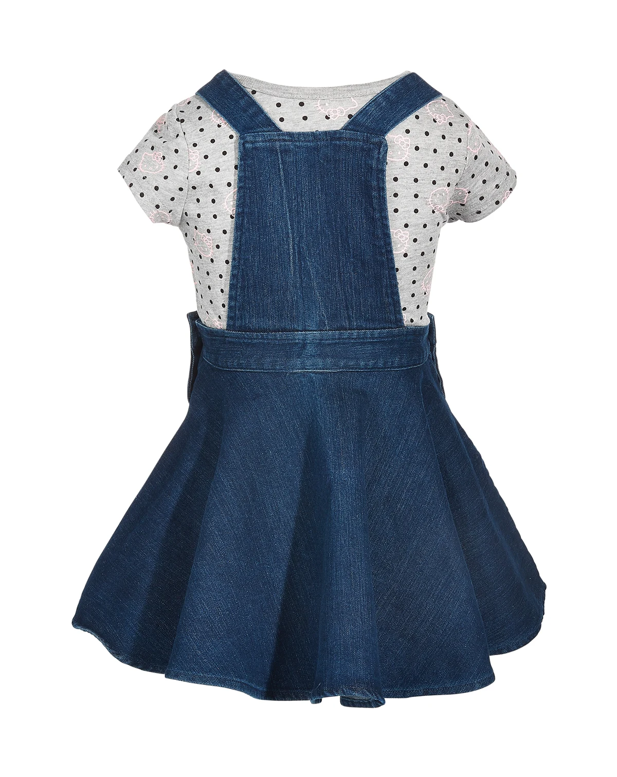 Adorable embroidery forms a Hello Kitty face at the bib of the denim skirtall on this sweet set, finished with an equally cute dot and Hello Kitty print T-shirt.