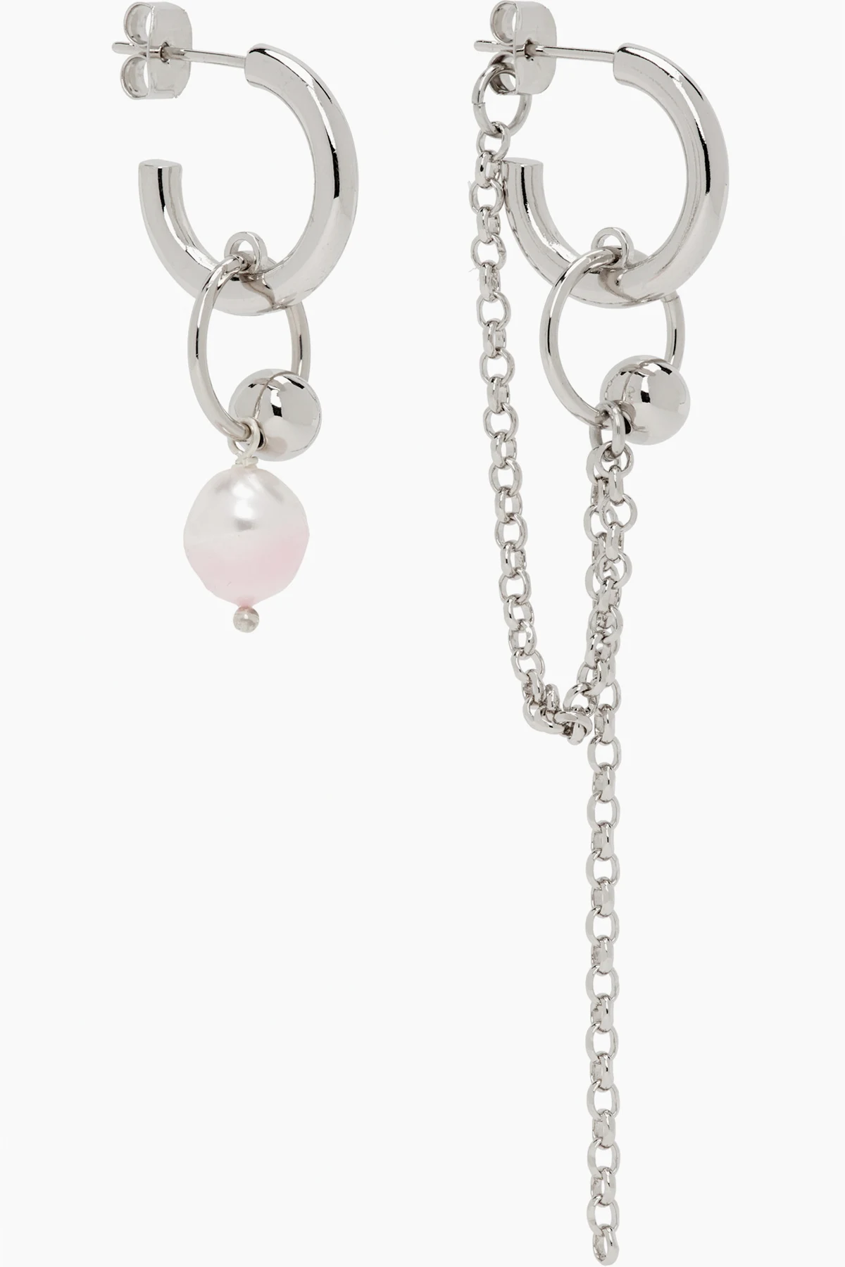 Pair of handcrafted mismatched open hoop earrings in palladium-plated brass.