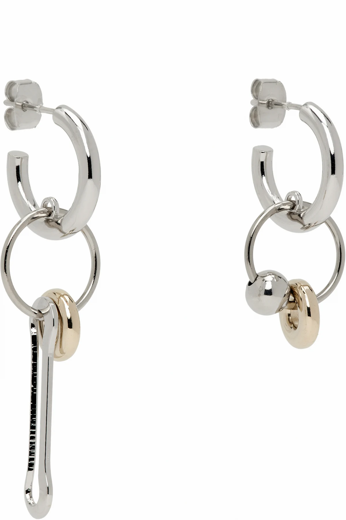 Pair of mismatched drop earrings in 24k gold- and palladium-plated brass.
