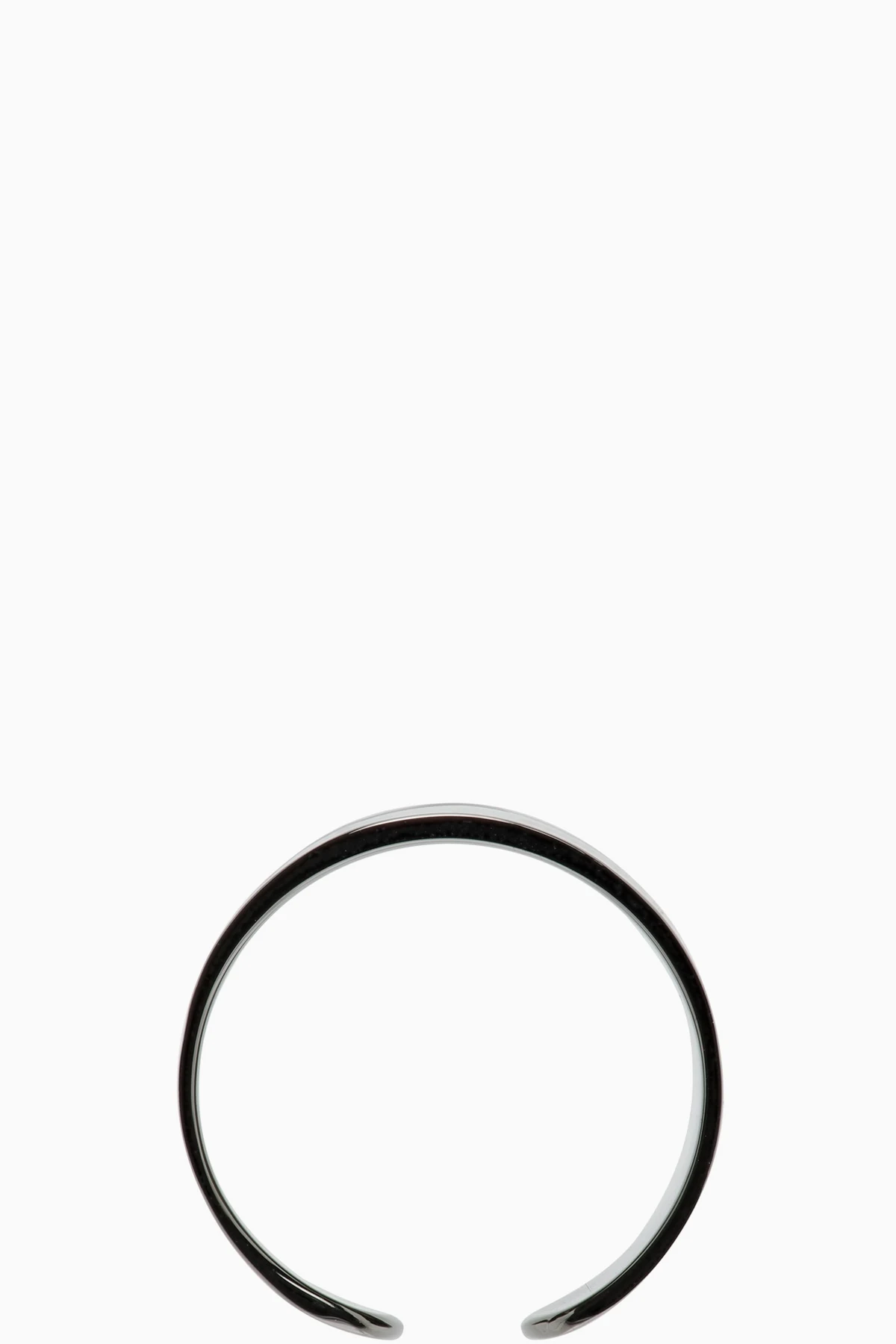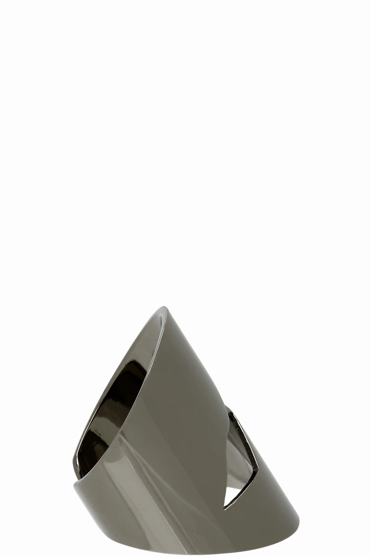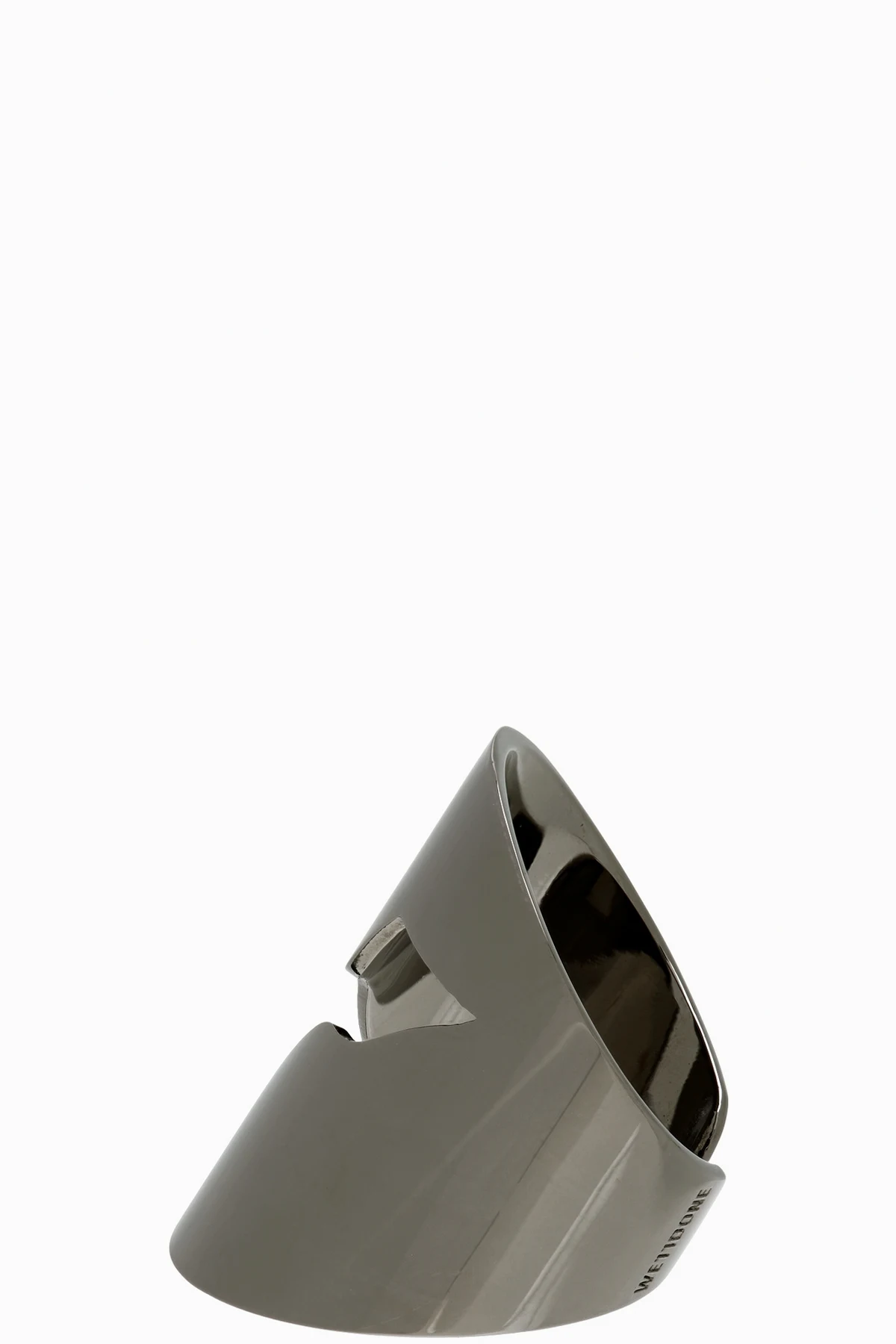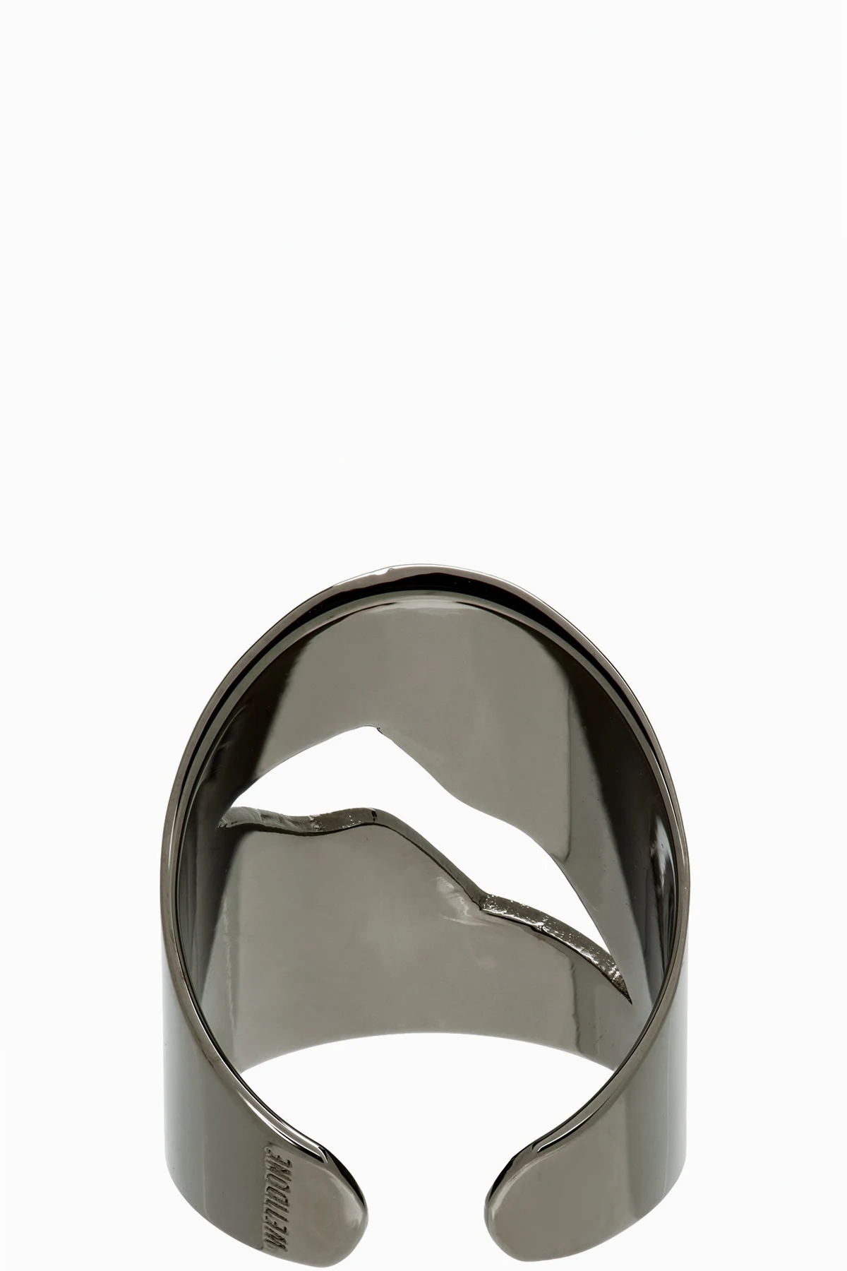 Open band ring in gunmetal-tone brass. Logo cut-out at face.