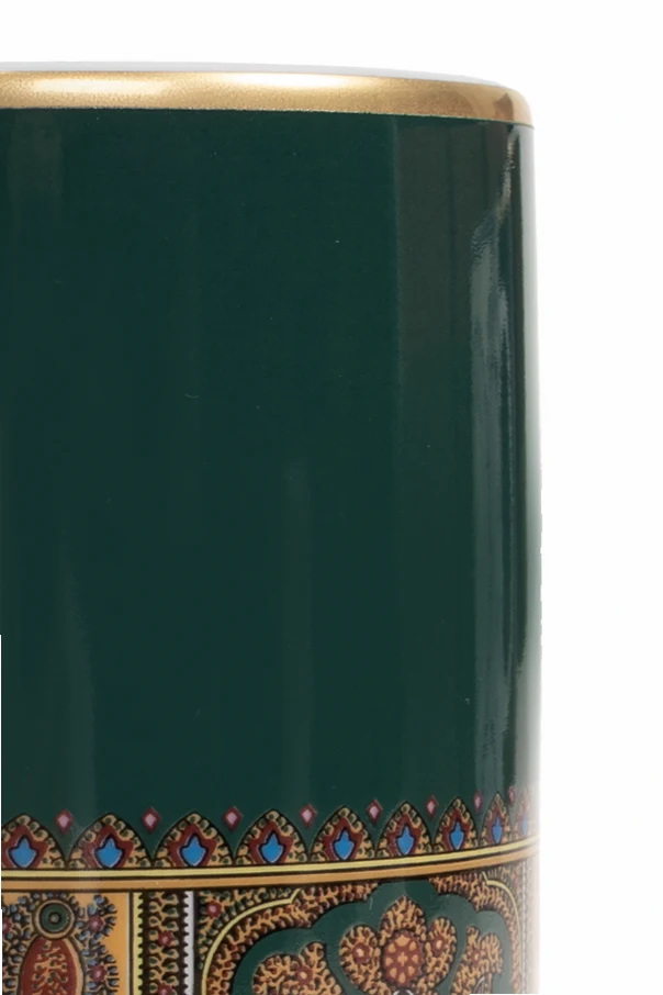 Adorned in a deep green finish, this piece captivates with a lavish ornamental band at its base—an exquisite motif inspired by oriental artistry, where vivid florals and paisley elements intertwine in rich tones of crimson, gold, blue, and navy. The luminous, glossy porcelain exterior enhances its opulent appeal, while a subtle gold accent along the rim lends a final, graceful touch.