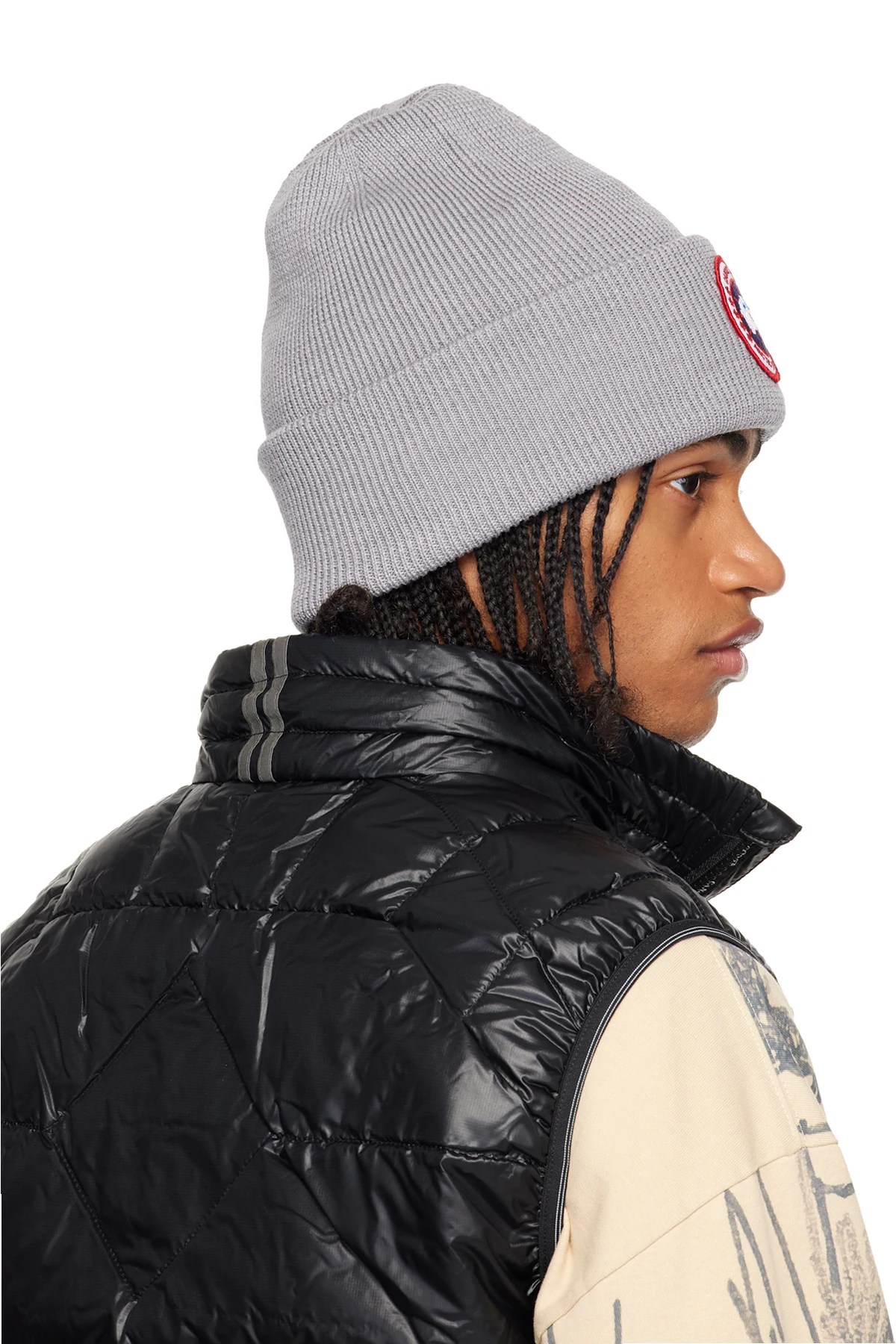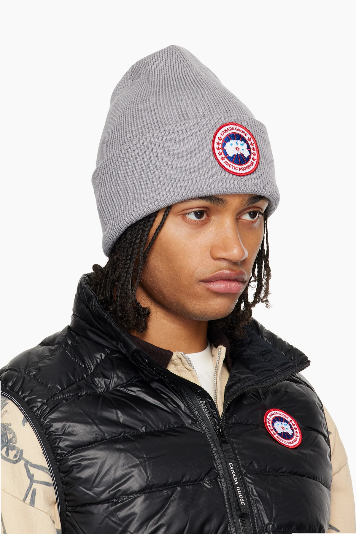 Rib-knit wool beanie. Embroidered logo patch at rolled brim.