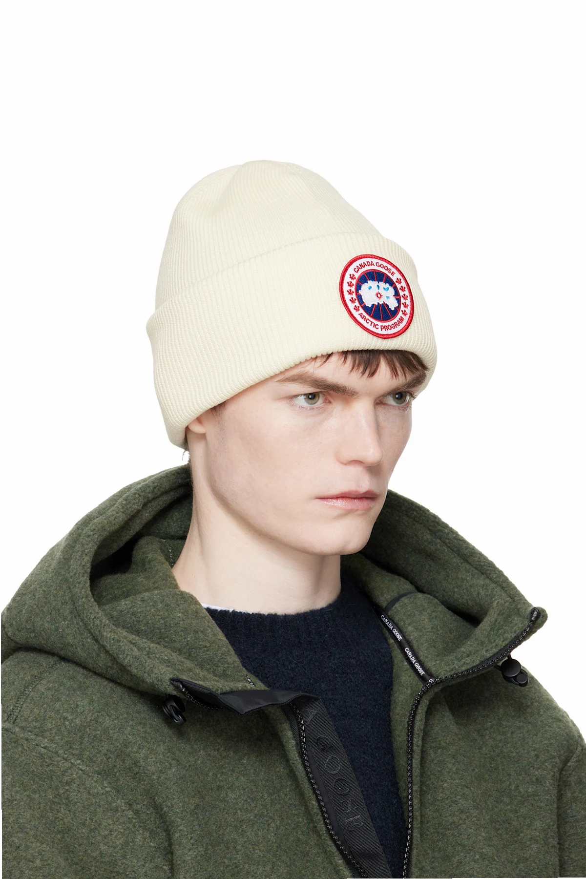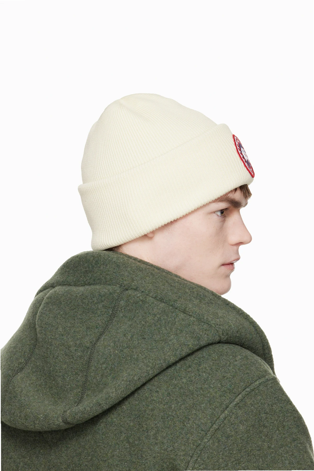Rib-knit wool beanie. Embroidered logo patch at rolled brim.