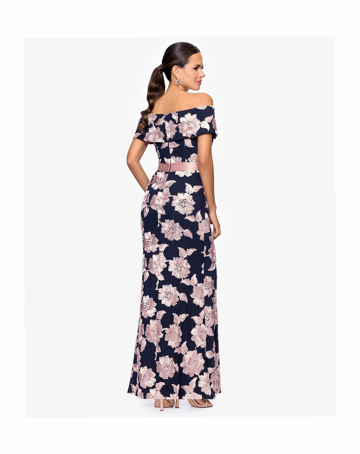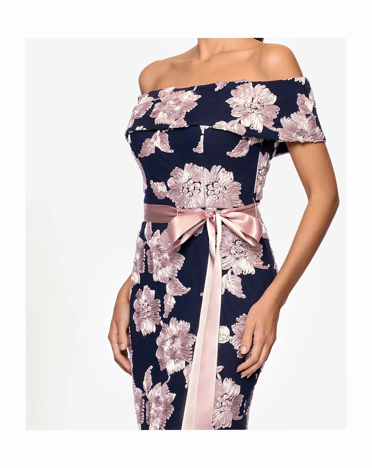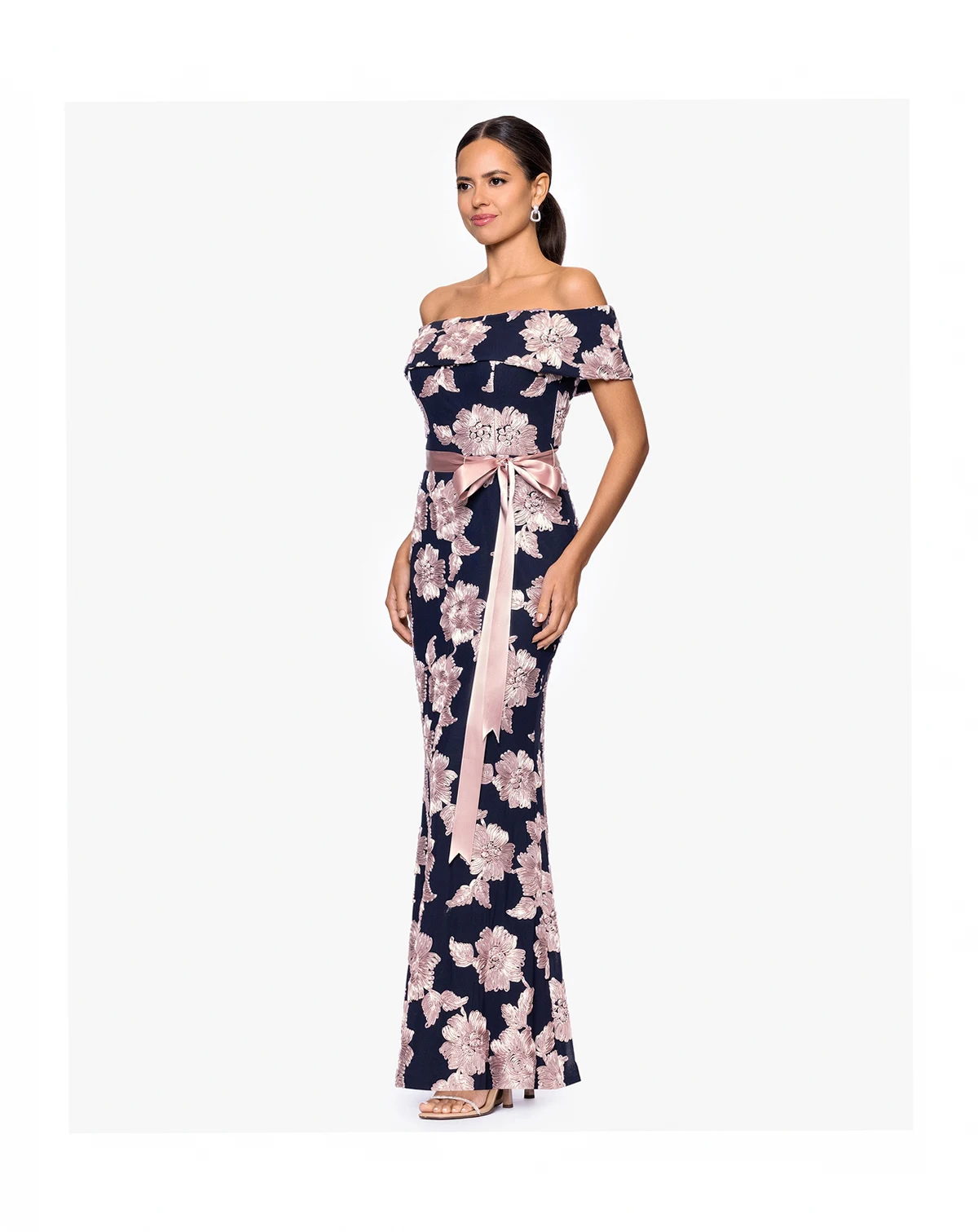 An off-the-shoulder neckline and waist ribbon add feminine charm to this Betsy & Adam dress. Sleek sleeveless styling creates a polished, sophisticated profile.