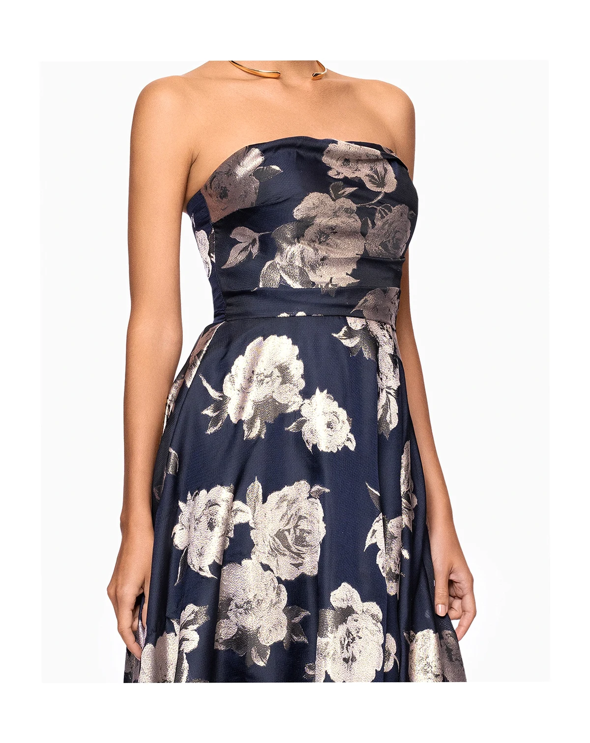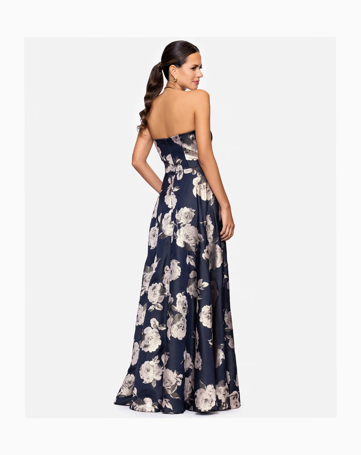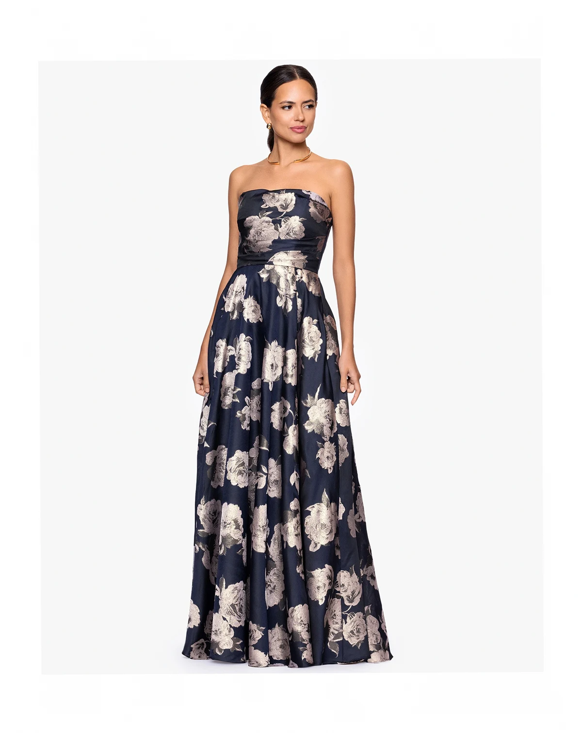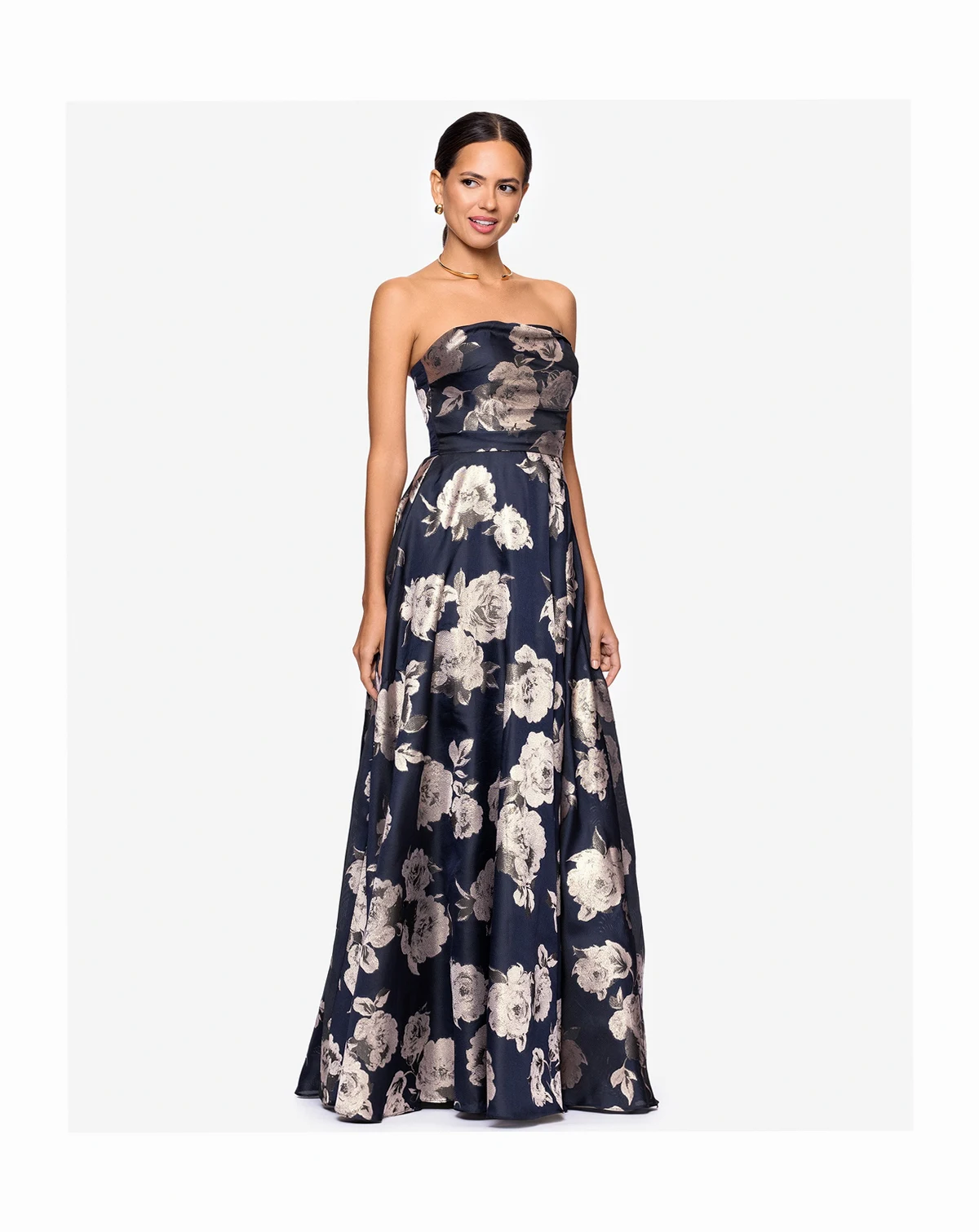 Boasting a strapless design and functional hip pockets, this long A-line dress by Betsy & Adam blends elegance with practicality. A back zipper delivers a comfortable, secure wear.