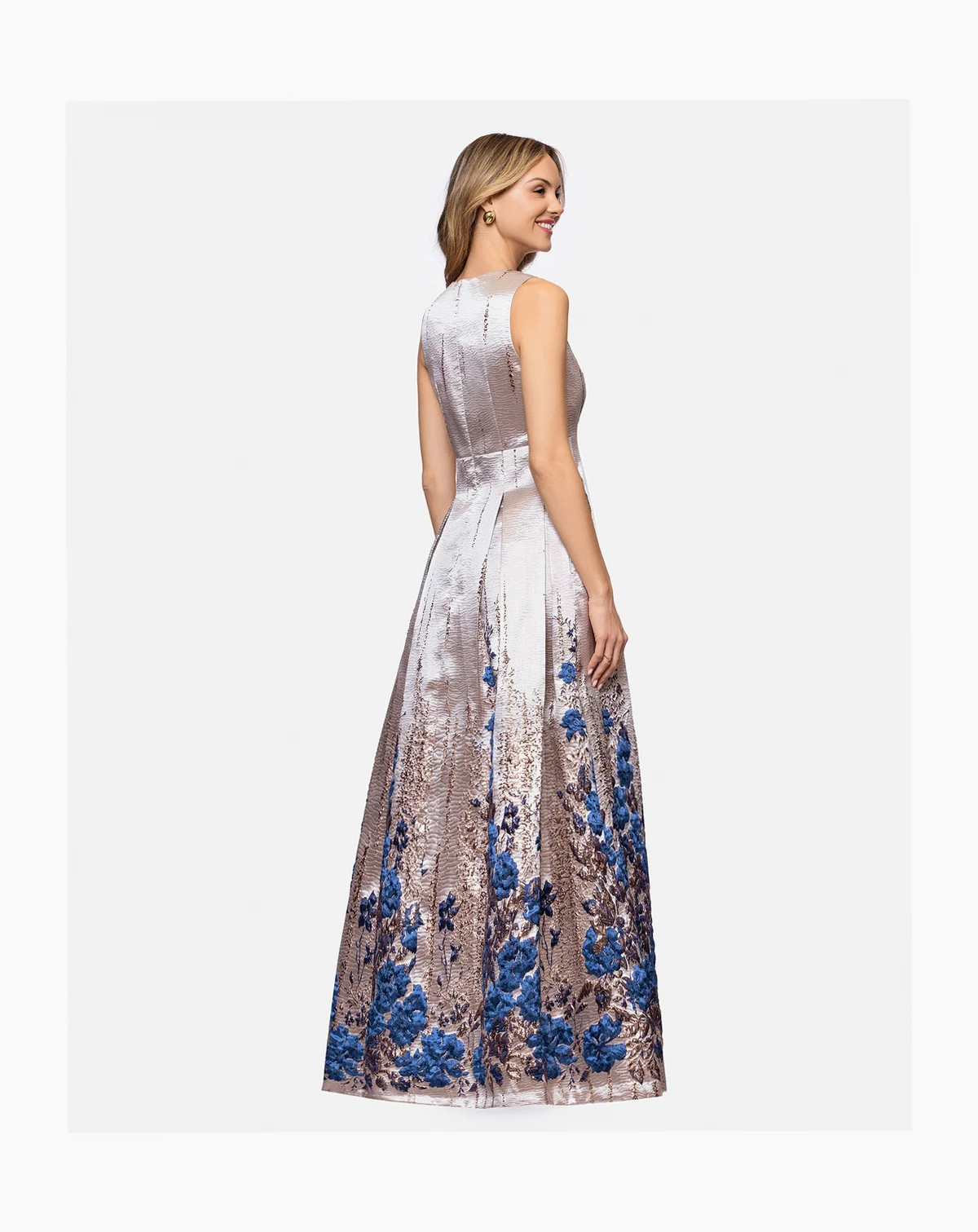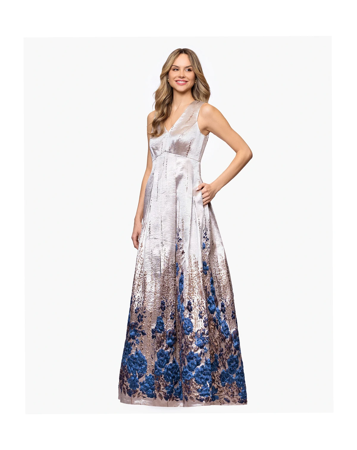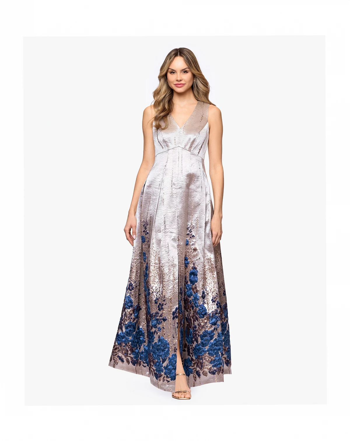 Make a formal statement in this dress by Betsy & Adam, featuring a long V-neck style with jacquard print and functional pockets. A center back zipper and A-line silhouette create a flattering, elegant look.