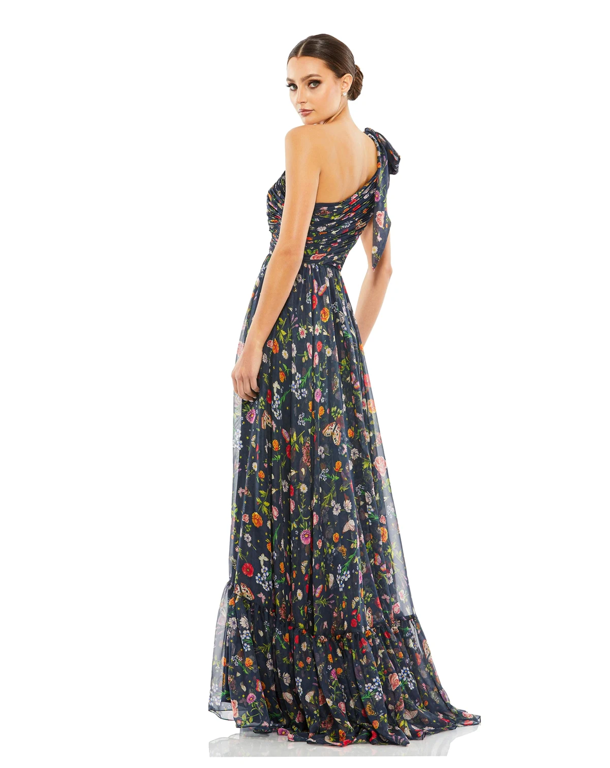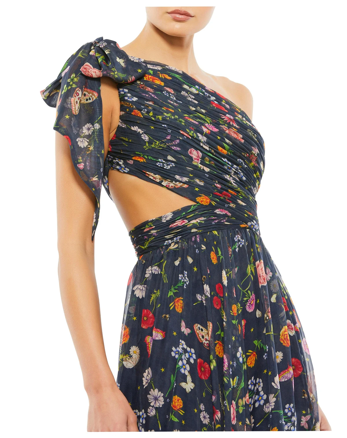 This flowy gown features a tied one-shoulder design and a chic cut-out detail, offering a modern yet elegant look. Perfect for formal occasions, it exudes effortless sophistication.