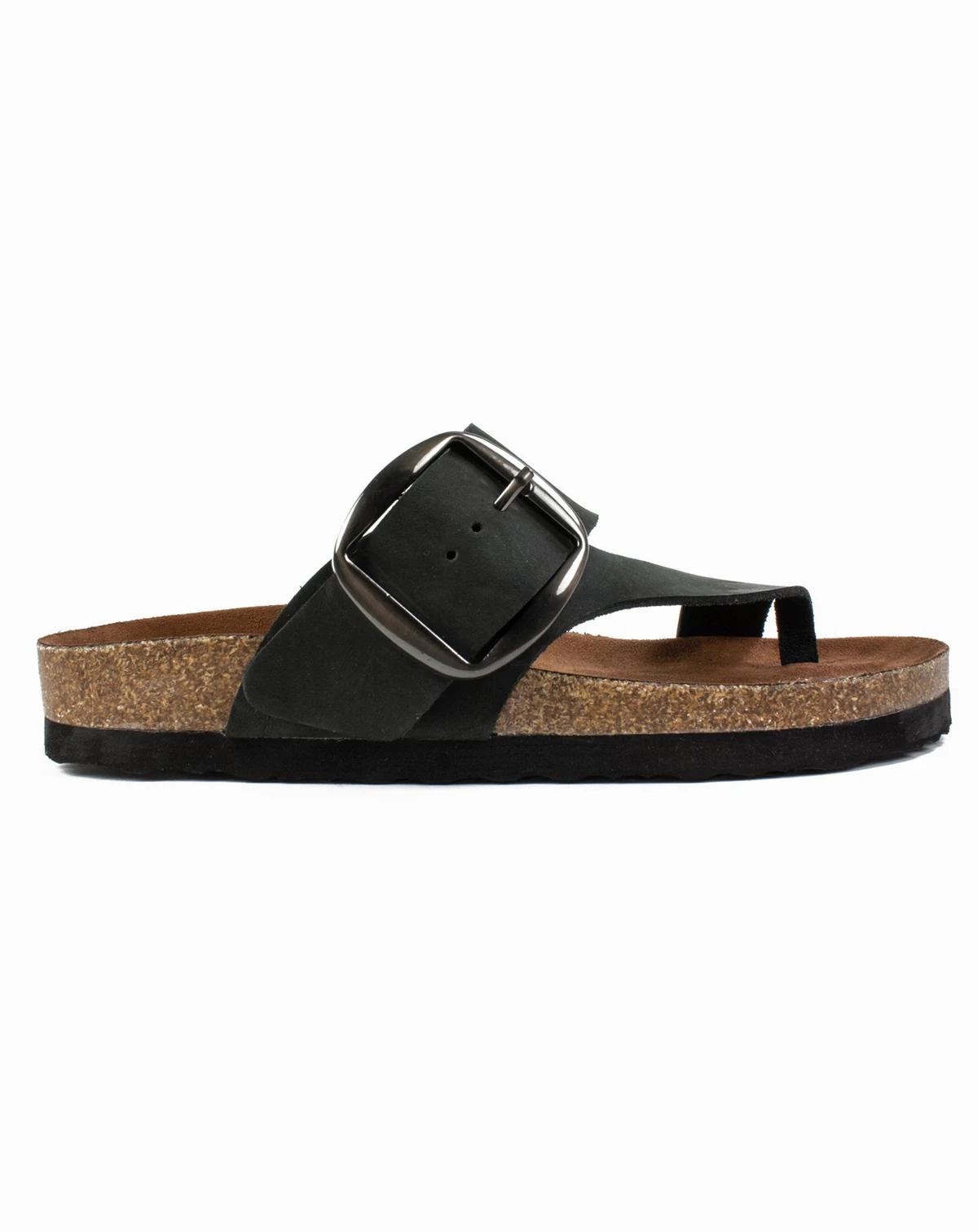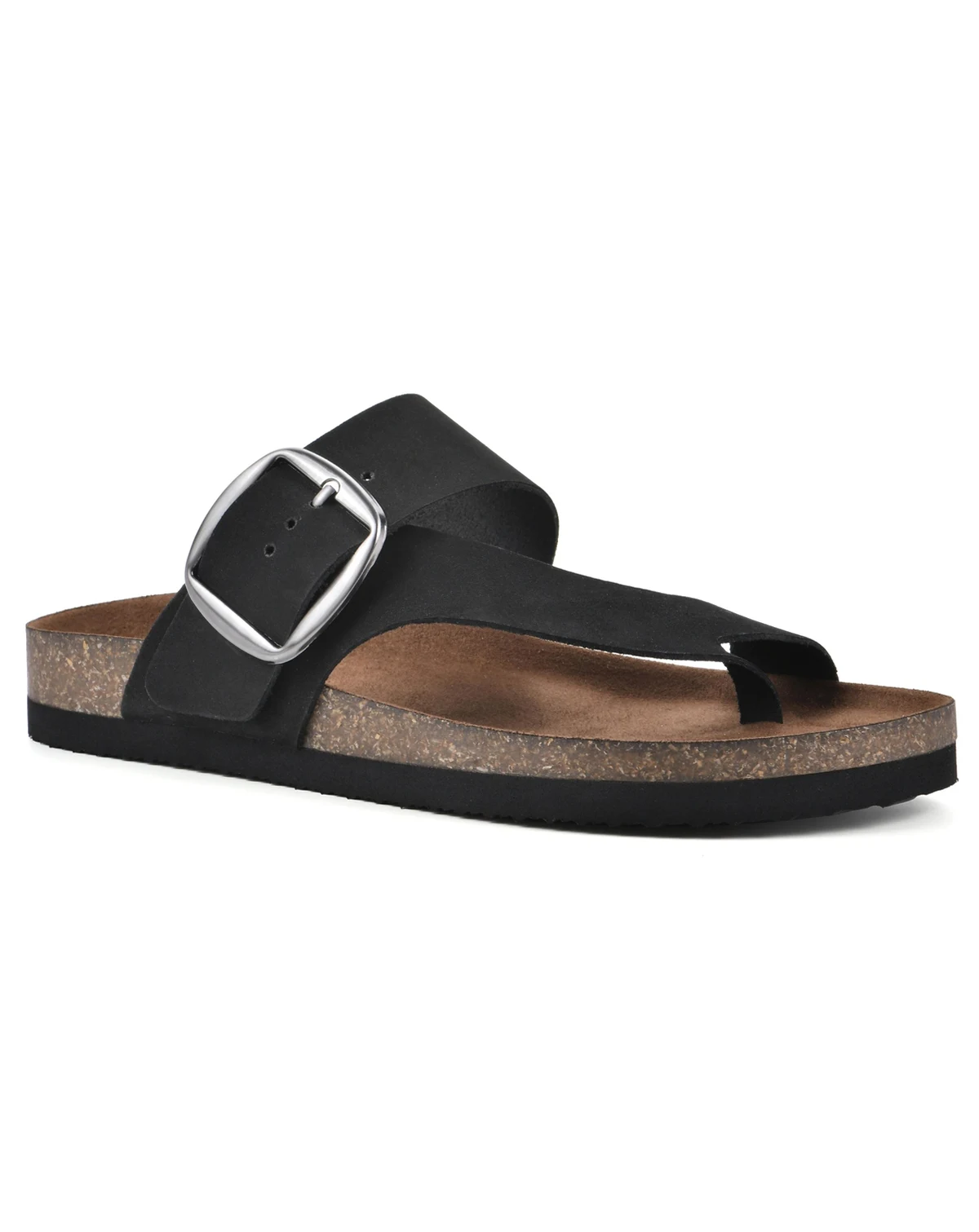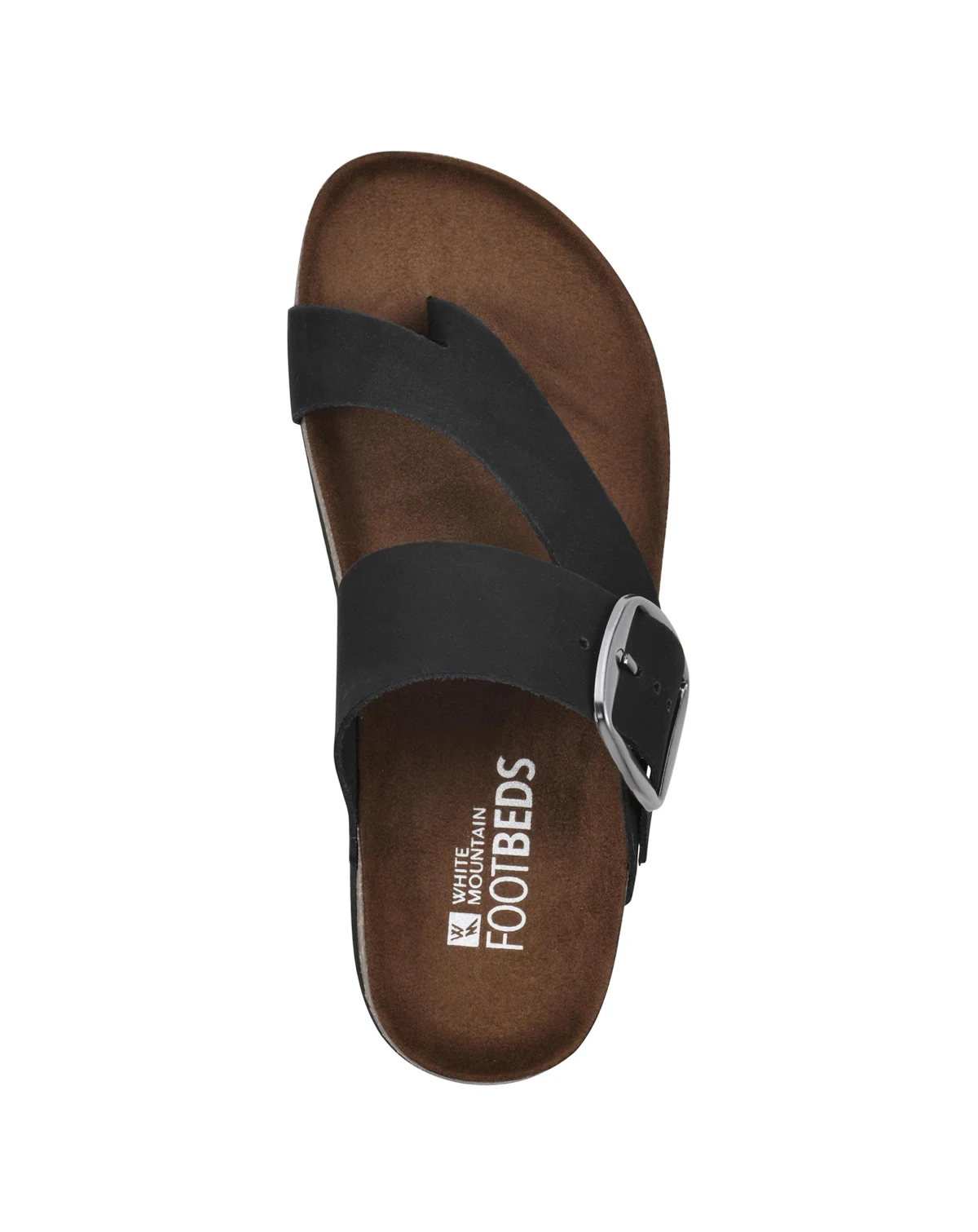 The Harley slip on thong sandal by White Mountain footbeds features a molded suedette footbed and comfort heel cup. The extra wide strap features an exaggerated brass buckle detail for a fresh fashion forward look.