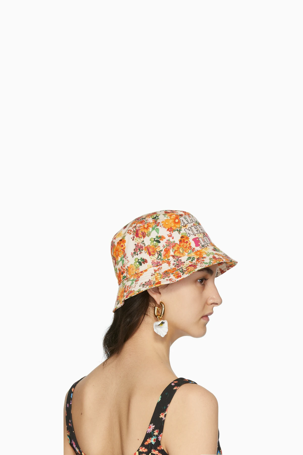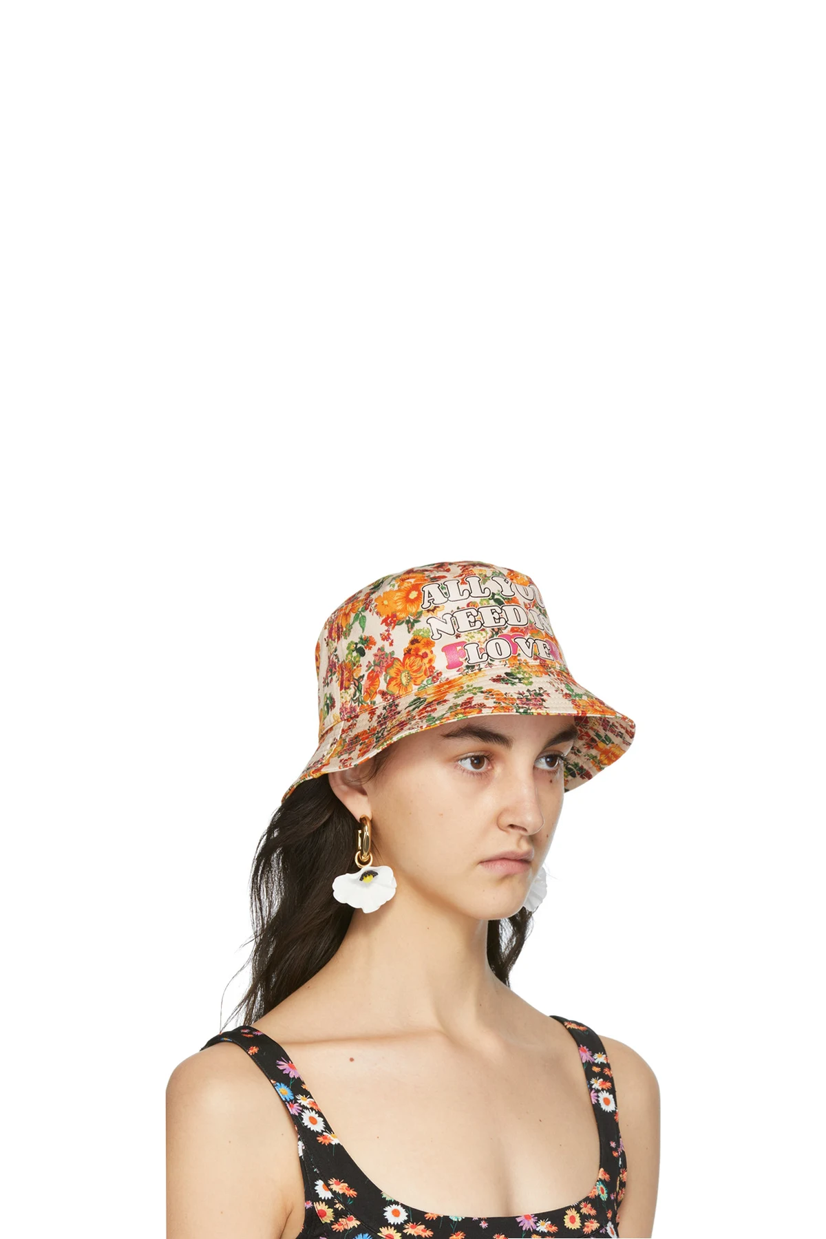 Cotton jersey bucket hat in beige featuring multicolor floral pattern. Text bonded in white and pink at face.
