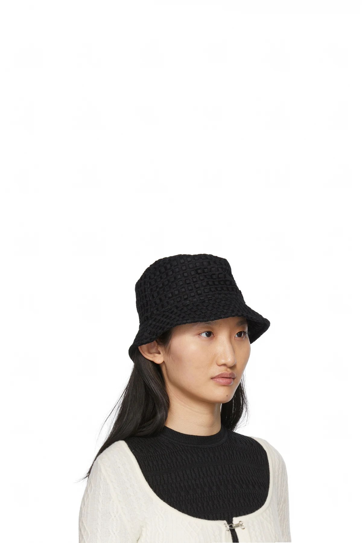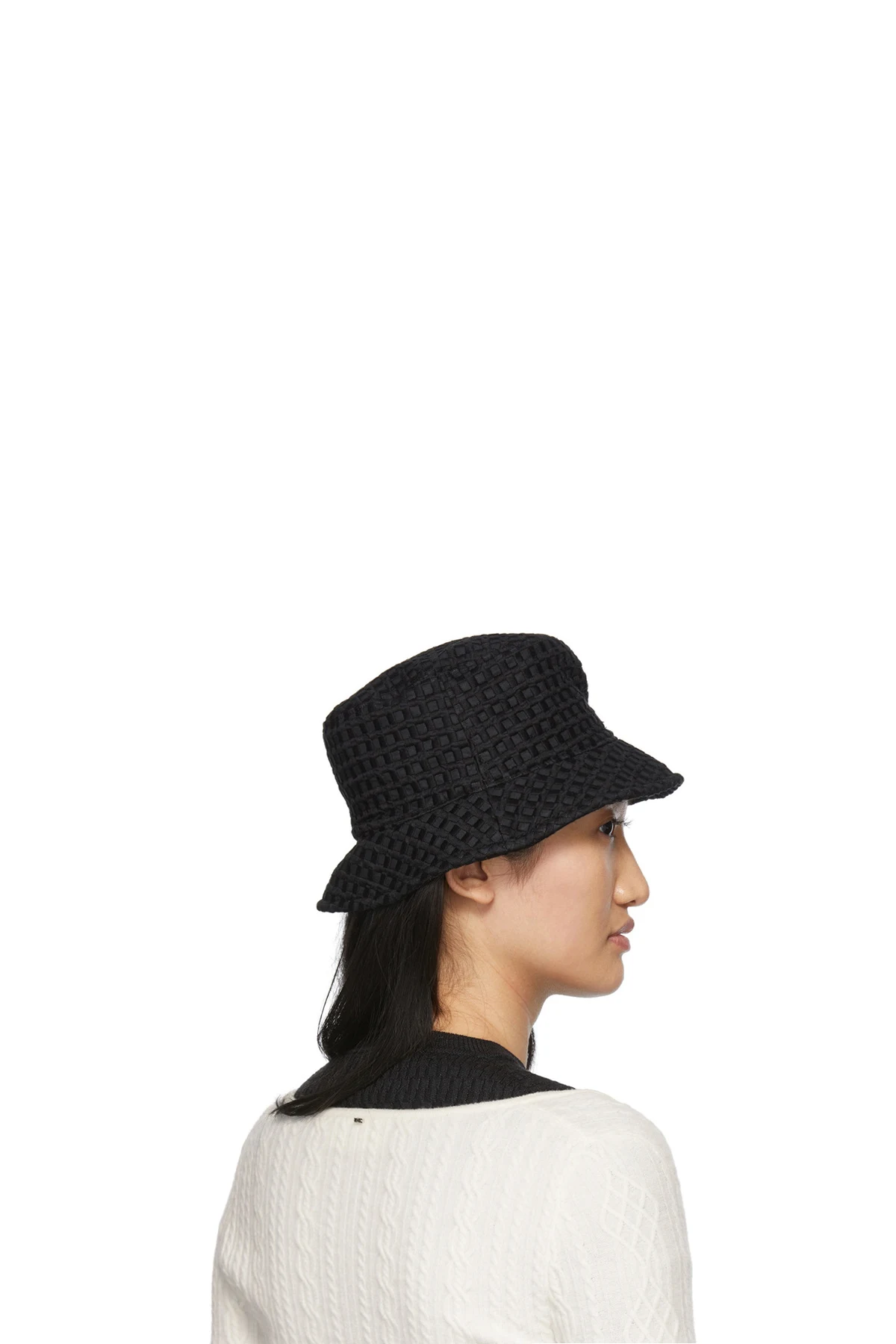 Handcrafted black woven cotton-blend beach hat featuring threaded detailing in check pattern throughout. Tonal logo hardware at side.